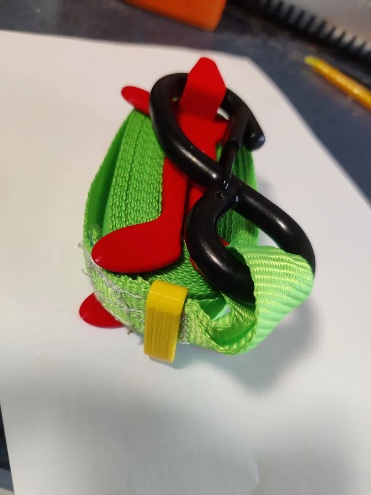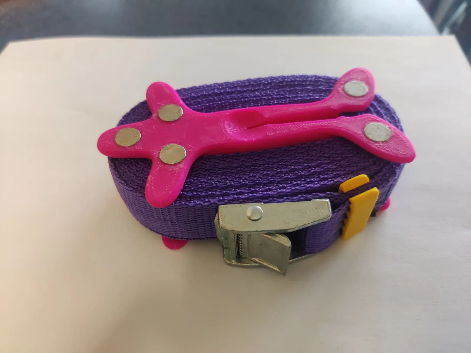 Cuộn dây rachet với nam châm, có tùy chọn móc hoặc không. Dây dài 5m, rộng 25mm, in bằng PETG. Có sẵn gcode cho ORCA Slicer và file STL kẹp. Thích hợp để quản lý dây đai gọn gàng.