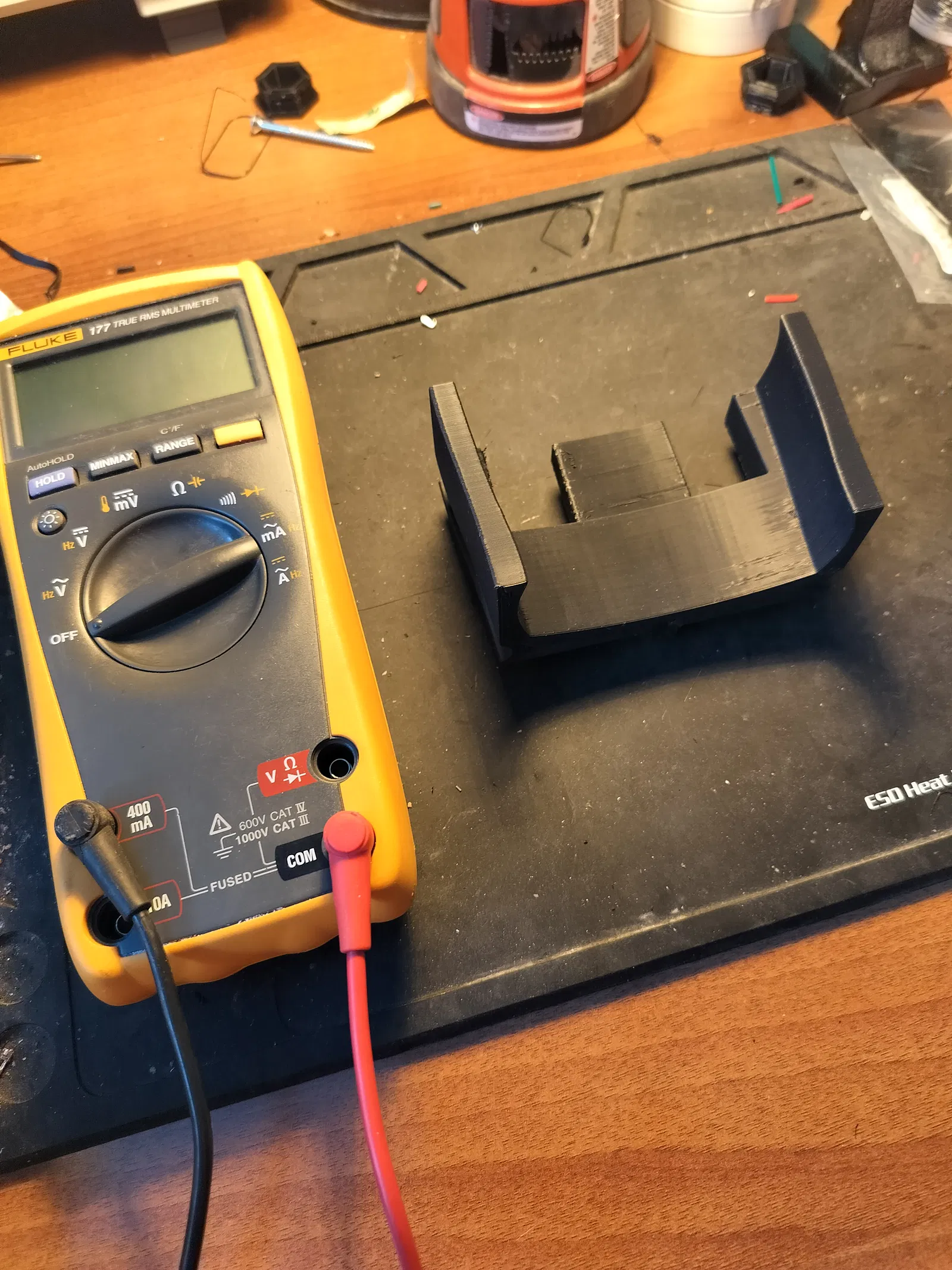 Nên đây là phiên bản cái đế của tui, cho phép người dùng nhét cái Fluke vô, giữ mấy cái que đo hai bên (Hoặc quấn quanh cái đế), còn màn hình, nút điều khiển với mấy cái lỗ cắm đều không bị cản.