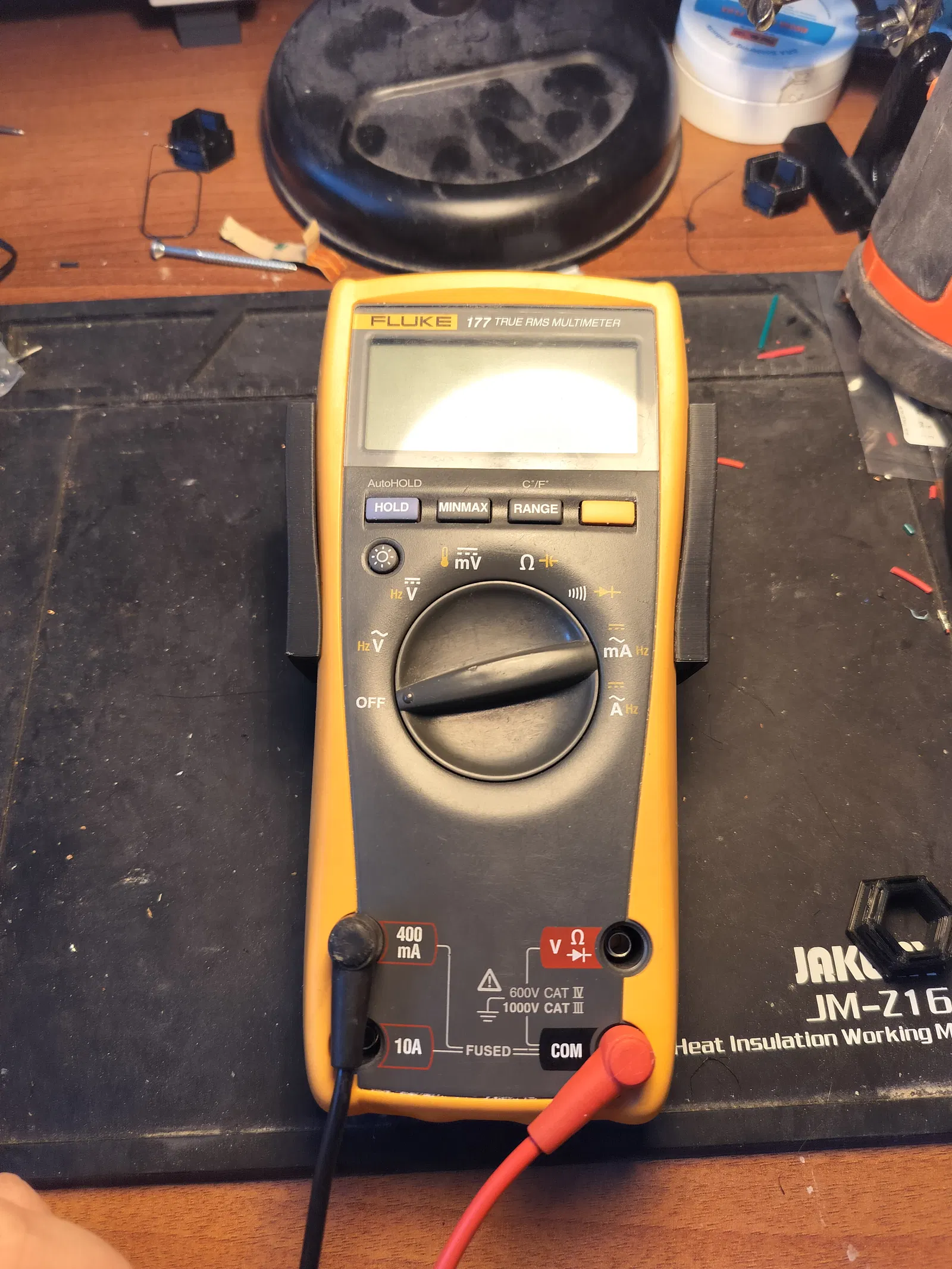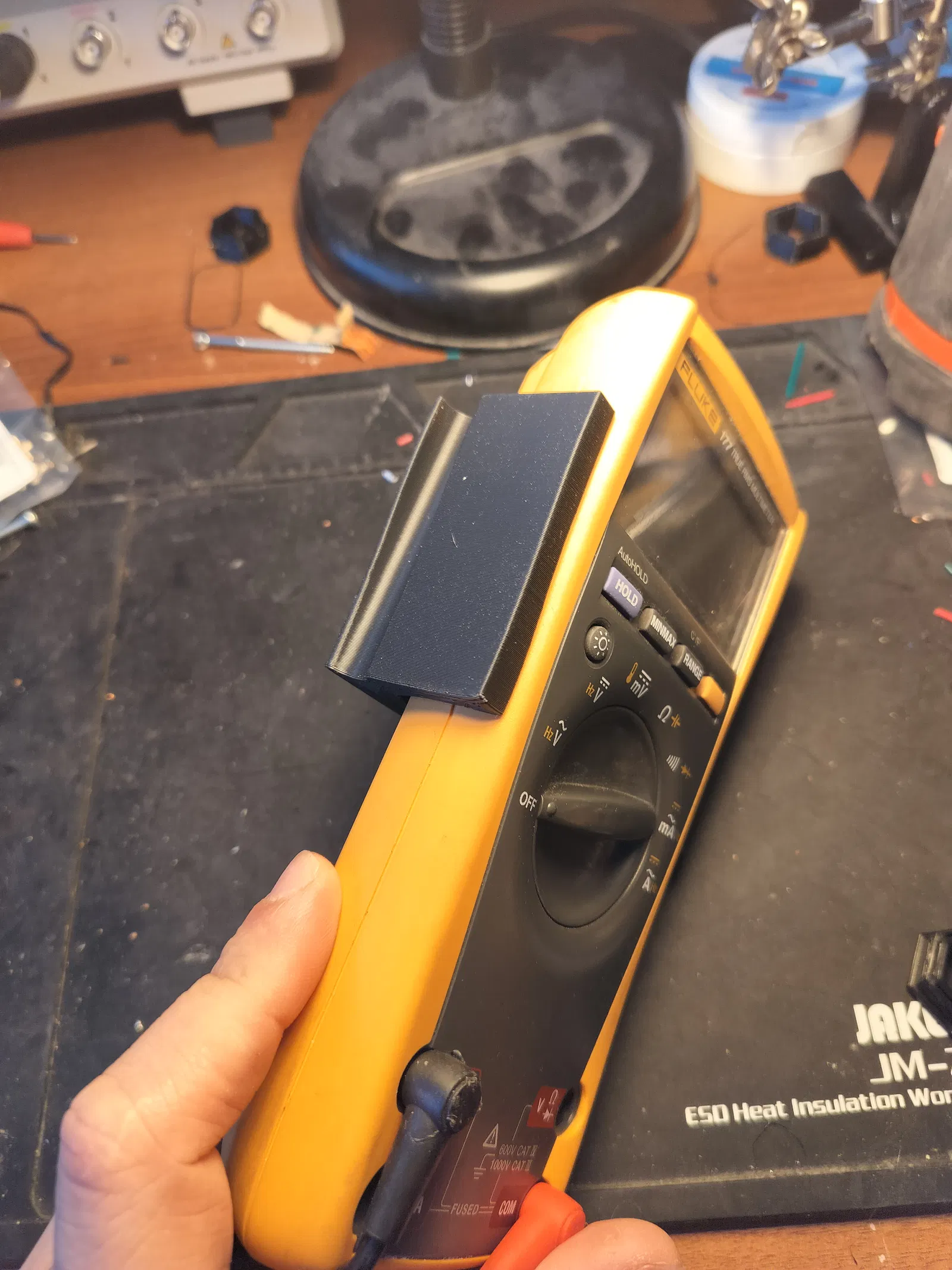 Giá đỡ HSW để giữ Fluke 177 không bị cản trở, vừa khít nhưng cũng dễ dàng tháo lắp. Sau khi xây dựng HSW, tui muốn treo đồng hồ vạn năng Fluke 177 lên tường. Giá đỡ này cho phép nhét Fluke vào, giữ dây đo hai bên và không cản màn hình, nút điều khiển.