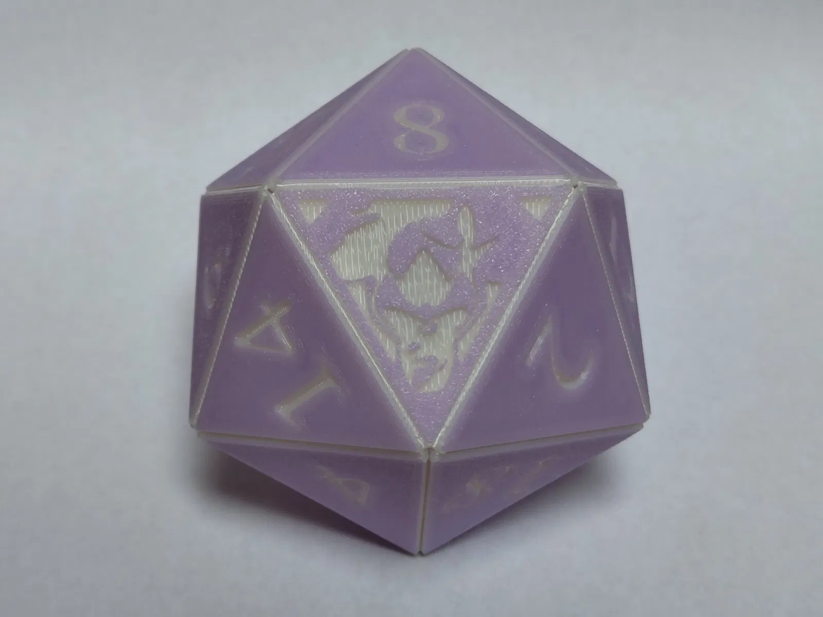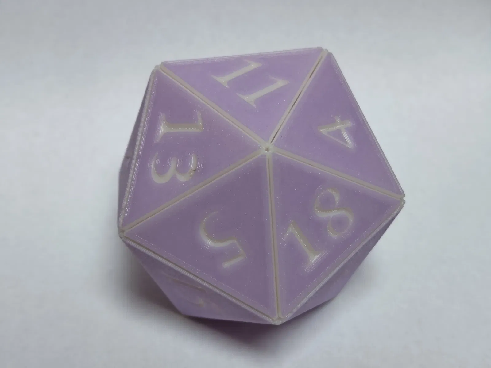 Cái xúc xắc 20 mặt cỡ lớn, gấp lại để lắp ráp - nó tự snap lại với nhau. Cái này có 2 lợi thế lớn là lớp đầu tiên mịn màng phủ hết bề mặt xúc xắc và bạn có thể đổi màu filament để số tương phản.