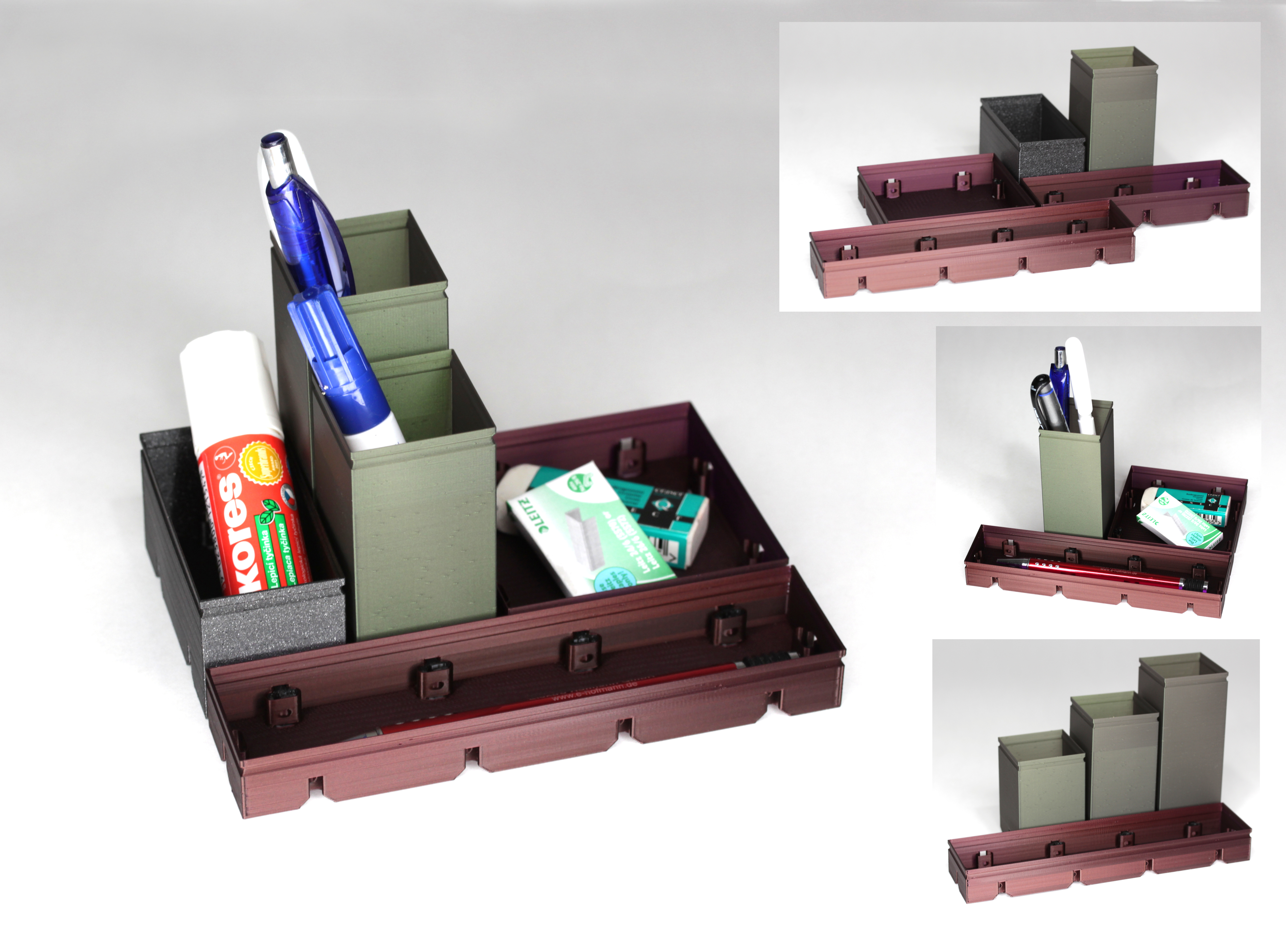 Hệ thống lưu trữ module đa năng, có thể dùng ở bàn làm việc, nhà tắm, nhà bếp. Khả năng mở rộng linh hoạt, tạo sự ngăn nắp với lượng filament tiêu thụ cực thấp, ít hơn 70g cho mẫu như hình. In nhanh chóng.