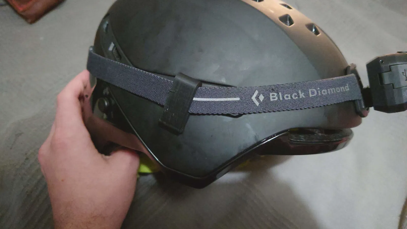 Kẹp đơn giản để giữ đèn pin đội đầu trên mũ bảo hiểm Dynafit TLT. Vị trí thay cho tấm che nắng.
