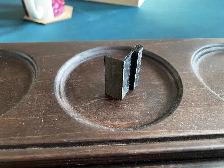 Tụi mình có cái bàn Sunnygeeks xịn sò của Rathskellers, mà có vụ nhỏ là mấy cái ngăn kéo ở cạnh ngắn của bàn á, nó bị trượt ra ngoài được. Nên tui mới thiết kế với in 3D cái pát nhỏ xíu để chặn nó lại. Mấy cái pát này nó nằm giữa khung thép với gỗ ở chân bàn, mỗi bên bàn có một cái, là ngăn kéo nó nằm yên luôn.