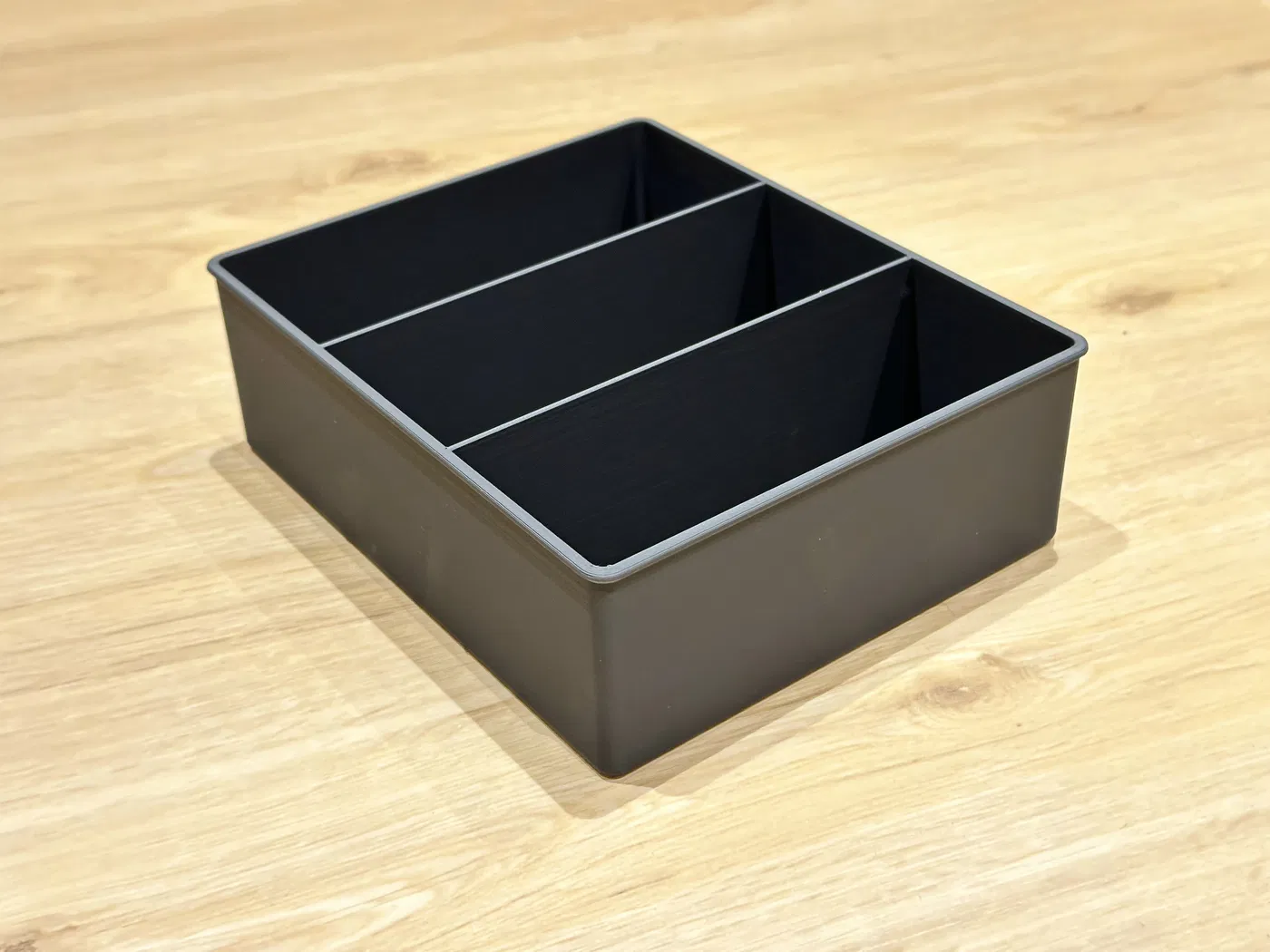 Hộp đựng đồ cá nhân với 3 ngăn, kích thước 182x150mm, cao 60mm. Hai ngăn có đáy gồ ghề, lý tưởng để đựng vỉ thuốc hoặc các vật dụng nhỏ khác. Thành hộp dày 1.6mm, có thể in với đường kính 0.4mm và 2 lớp tường.
