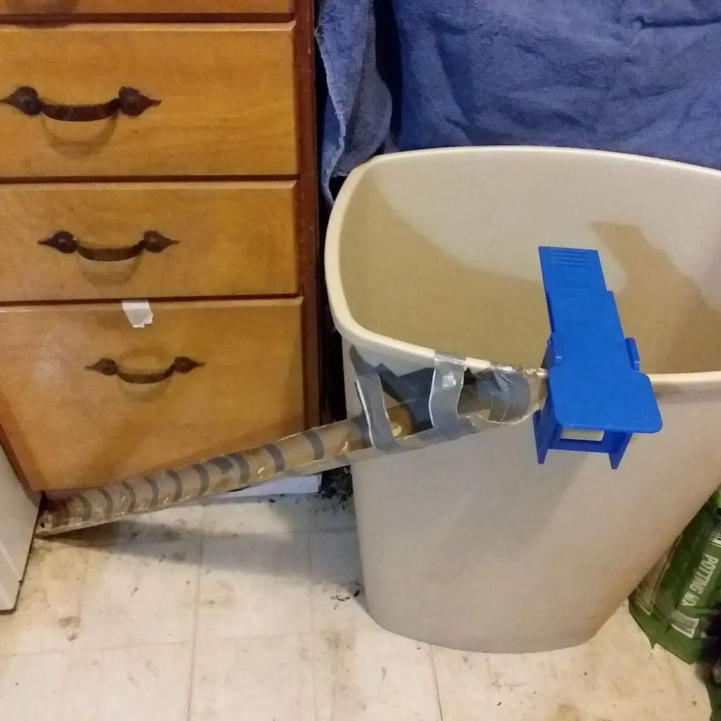 Khung bẫy được thiết kế để gắn vào thùng thường/cao, thùng đựng rác mèo, hoặc thùng rác nhà bếp kiểu Rubbermaid. Hầu hết các loại thùng tương tự đều dùng được, miễn là vành thùng không quá dày, nhưng mình chỉ có 3 loại đó để thử thôi. Bạn có thể cần dùng thêm băng dính để cố định bẫy cho chắc, tránh bị xê dịch hoặc rơi ra khi dùng, tùy thuộc vào loại thùng bạn gắn vào.