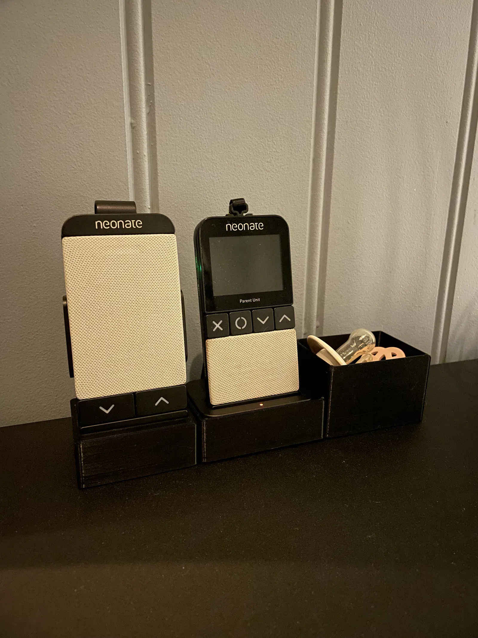 Tui đã thiết kế một cái đế riêng cho màn hình em bé Neonate N65, giúp sắp xếp gọn gàng và dễ lấy hơn. Cái đế tùy chỉnh này xếp thẳng hàng cả cục sạc lẫn nhiều cục phát cho em bé, đảm bảo mọi thứ đều trong tầm tay. Ngoài ra, nếu ai cần một bộ nhỏ gọn hơn, thì có thể chỉ in một phần của cái đế thôi. Các nắp bịt cuối được kèm theo để che các phần không xài tới một cách gọn gàng, giữ cho nó trông đẹp và ngăn nắp.