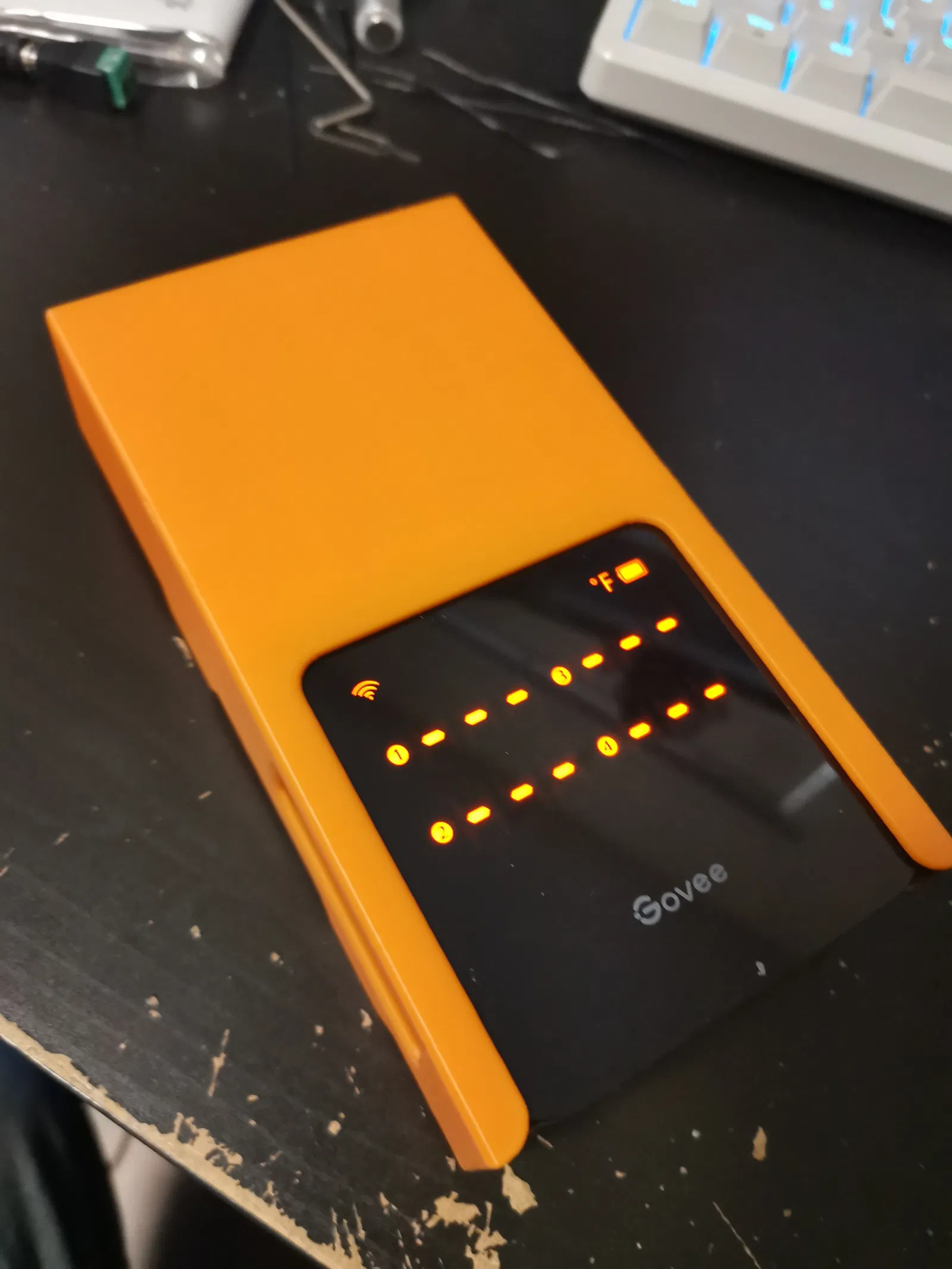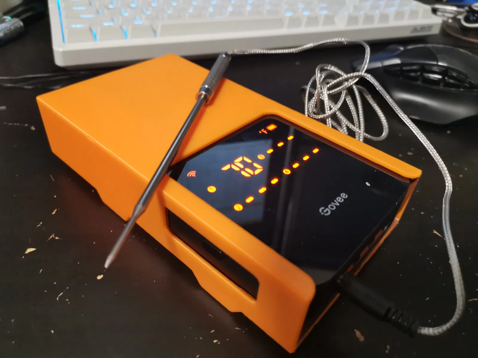 Cái nhiệt kế Govee H5198 xài cũng được, nhưng mà có 4 cái que dài với dây nhợ lằng nhằng, xài xong cất đi không có gọn. Nên tui chế cái hộp này để giữ nó lại cho dễ.