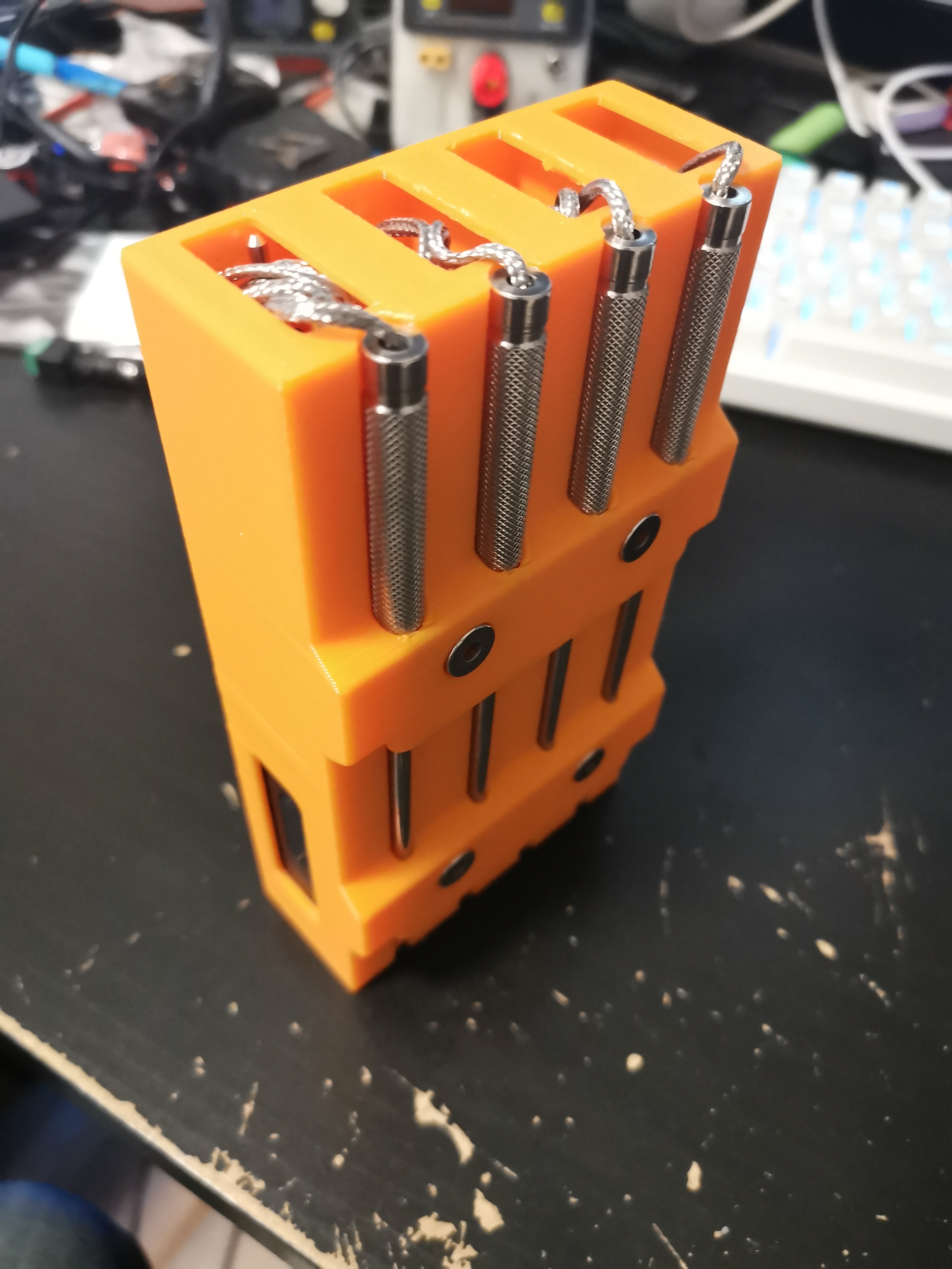 Cái nhiệt kế Govee H5198 có 4 que đo dài, xài xong cất đi hơi lỉnh kỉnh. Nên tui chế cái hộp này để giữ gọn gàng, có khoét lỗ cắm sạc, có móc treo, và chỗ để nam châm. Chất liệu PLA, in STL, cần dọn support để que dễ cắm.