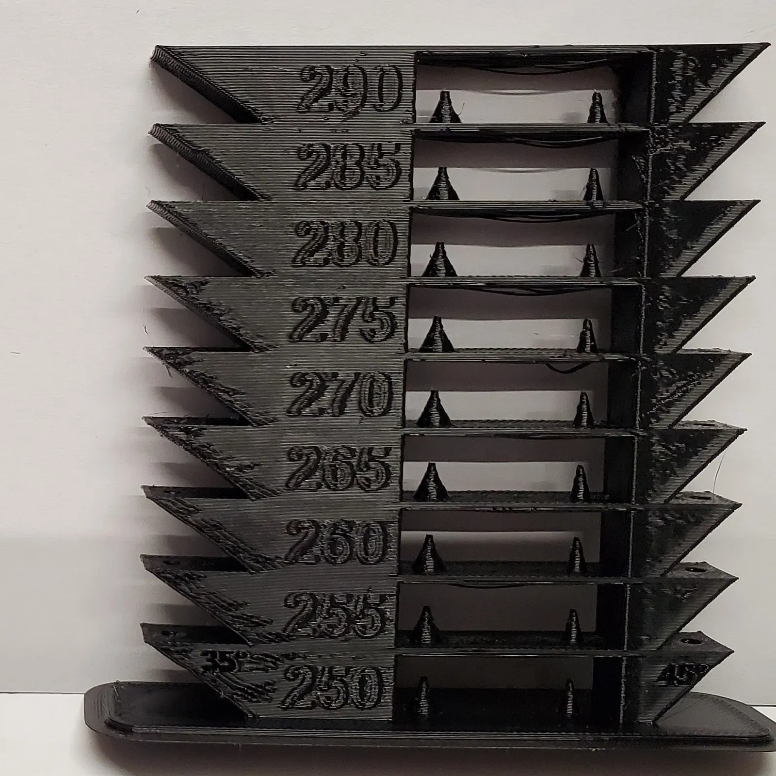 Mình làm việc với PETG trên máy Bambu X1, cần một tháp nhiệt độ có G-code để chạy trên Bambu Studio. Các cài đặt sẵn cho PETG thì ổn, nhưng mình muốn thử in nhanh hơn. Tháp nhiệt độ này được phát triển dựa trên công trình của Tronnic và Kryštof. G-code cho máy được thêm vào dựa trên hướng dẫn của Bambu. Nhiệt độ bắt đầu từ 250 độ C, vì mình nhận thấy ở nhiệt độ thấp hơn thì kết quả in rất tệ và phần đế bị gãy. Cài đặt hiện tại của mình cho eSun PETG (chỉ để tham khảo): Cài đặt Filament: Nozzle 280 độ C, bed 65 độ C, max flow 18mm², z-hop bật. Cài đặt Profile: Tốc độ tường ngoài và bề mặt 180 mms. Mình nhận thấy màu đen là màu hoạt động kém nhất, ví dụ màu trắng hoặc vàng hoạt động tốt hơn nhiều. Điều này thể hiện ở cả max flow (21mm² so với 28mm²) và khả năng xử lý max acceleration. Sử dụng nhiệt độ cao hơn có thể bù đắp phần nào, như được thể hiện qua các tháp nhiệt độ. Tăng tốc có vẻ là yếu tố hạn chế nhất đối với PETG màu đen mình đã thử. 10.000 chỉ là quá nhiều so với khả năng, nên có lẽ 4.000 sẽ phù hợp hơn. Các bạn cứ thử nghiệm và tìm ra cài đặt của riêng mình nhé. Và chia sẻ trong phần bình luận. Đây là lần đầu mình tải lên, nên mong các bạn thông cảm nếu cần cải thiện gì. G-code đã được bao gồm trong hồ sơ máy "Bambu …. - kopie" được chọn sẵn. Trong phần ‘g-code layer change’. (bao gồm trong file project 3mf). Chỉ cần chọn filament của bạn và in. Theo yêu cầu, mình đã thêm file STL không có g-code tùy chỉnh. File này không tự động thay đổi nhiệt độ, nên bạn cần tự thêm g-code tùy chỉnh (hoặc thay đổi nhiệt độ thủ công ở mỗi lớp). Ngoài ra, mình đã thêm hai tháp nhiệt độ phụ. Một cho 220-260 C và một cho 260-300 C. Dưới đây là g-code mình đã sử dụng trong file ở cài đặt mã máy theo lớp: ;BEFORE_LAYER_CHANGE G92 E0.0 ;[layer_z] {if layer_z>=1.05} M104 S250 M109 S250 {endif} {if layer_z>=11.05} M104 S255 M109 S255 {endif} {if layer_z>=21.05} M104 S260 M109 S260 {endif} {if layer_z>=31.05} M104 S265 M109 S265 {endif} {if layer_z>=41.05} M104 S270 M109 S270 {endif} {if layer_z>=51.05} M104 S275 M109 S275 {endif} {if layer_z>=61.05} M104 S280 M109 S280 {endif} {if layer_z>=71.05} M104 S285 M109 S285 {endif} {if layer_z>=81.05} M104 S290 M109 S290 {endif} Là phần tiếp theo của tháp nhiệt độ cho Bambu Studio này, mình cũng đã tạo tháp tăng tốc và tháp tốc độ. Có lẽ các bạn cũng có thể thử chúng? Trong trường hợp bạn gặp các lỗi dọc/vấn đề với dây đai răng cưa và muốn tìm hiểu, bạn có thể thử Thử nghiệm lỗi dọc Bambu (hoa văn lượn sóng) của mình.