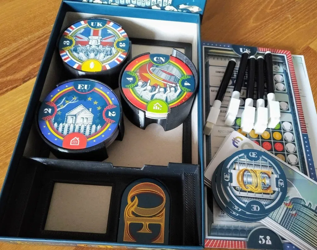 Đây là một bộ sắp xếp cho trò chơi boardgame Q.E. (Quantitative Easing) và sẽ giúp giữ tất cả các bộ phận không bị xáo trộn bên trong hộp.