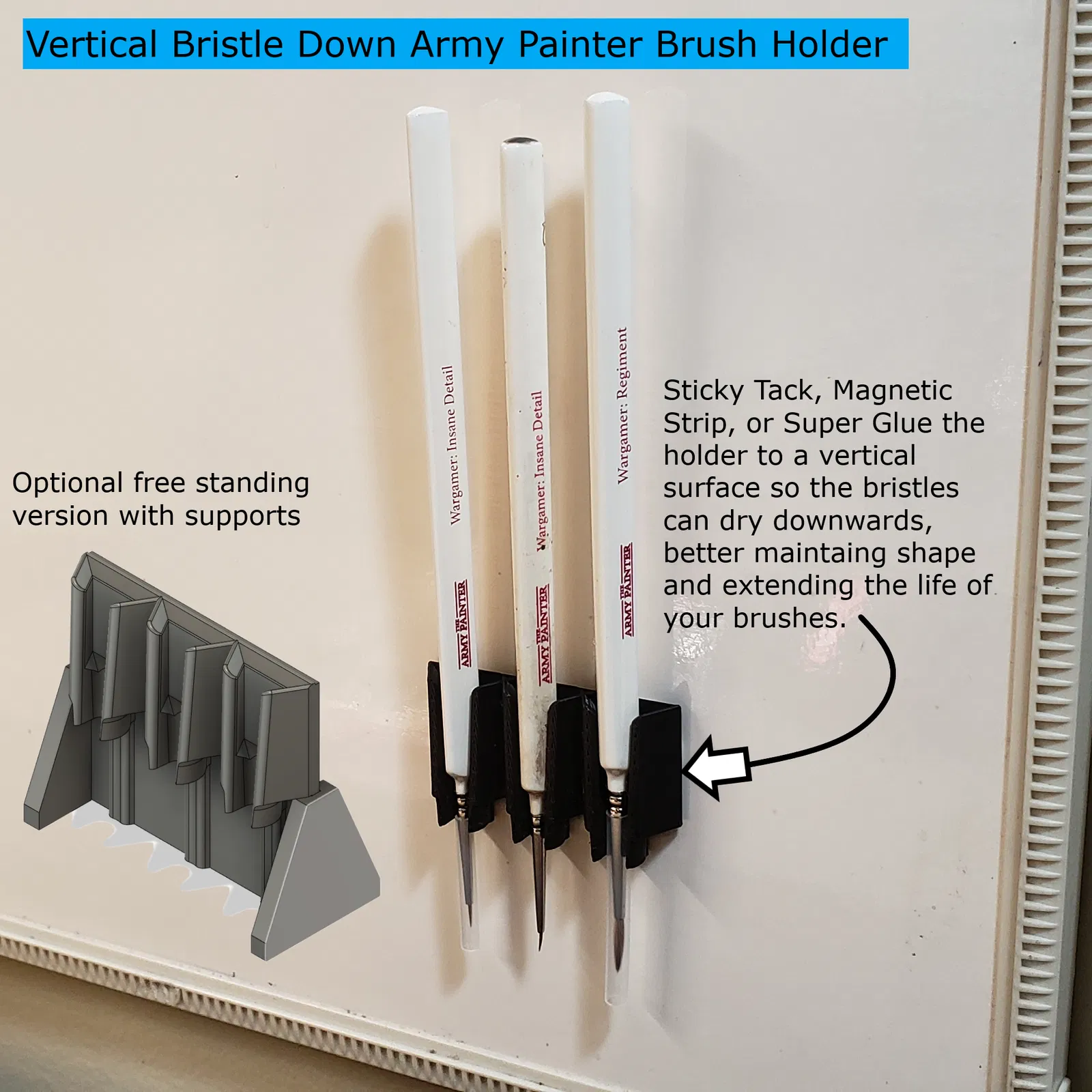 File STL bao gồm giá đỡ cho 1, 3 hoặc 5 cây cọ 3 cạnh thường được Army Painter sử dụng. Những giá đỡ này sẽ giữ cọ chắc chắn, không bị lung lay, giúp cọ khô theo chiều hướng xuống, kéo dài tuổi thọ của cọ và ngăn ngừa hư hại cho phần đai kim loại.