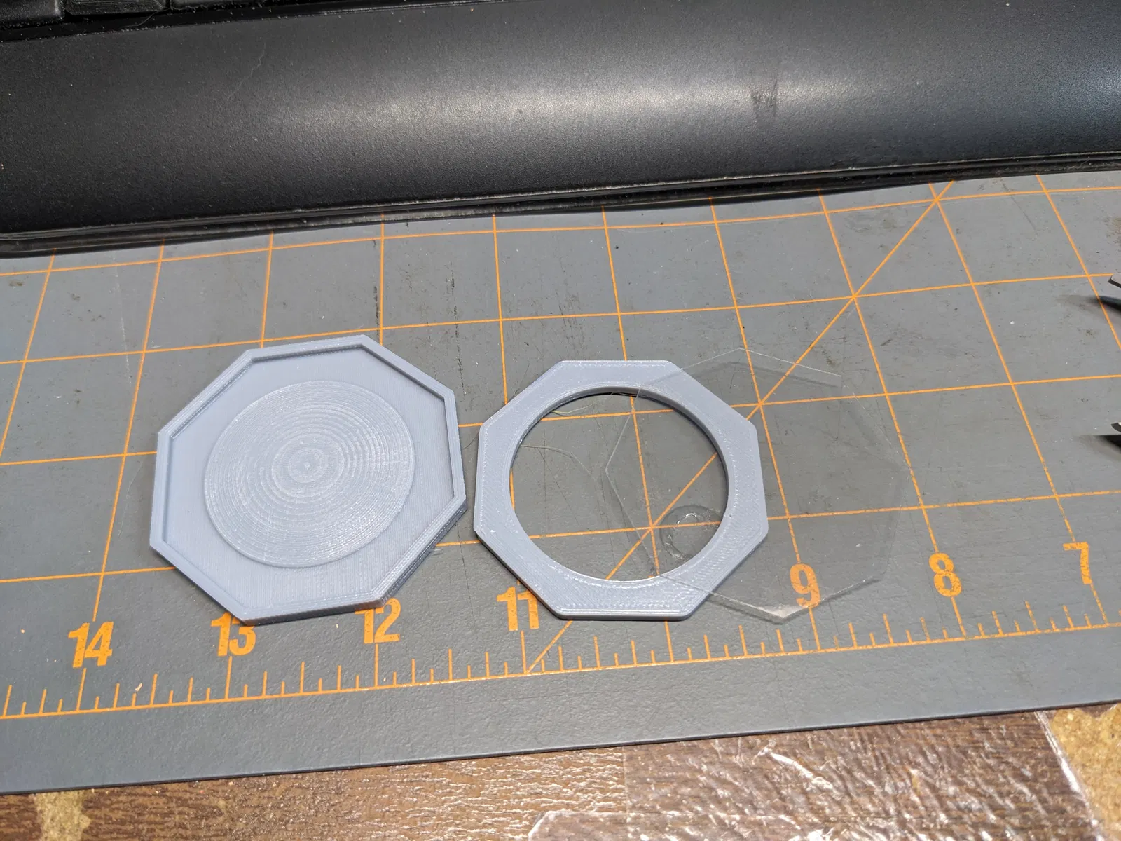Đặt miếng hình bát giác lên miếng Vòm, và làm nóng nhẹ bằng máy sấy khí nóng cho đến khi nó bắt đầu mềm ra; sau đó nhanh chóng ấn xuống bằng miếng Vòng để tạo hình thấu kính. Cuối cùng, tôi đã phải làm nóng và ép miếng nhựa hai lần để có được một thấu kính được định hình hoàn chỉnh. Tôi cũng nhận thấy rằng tấm nhựa bị mờ đi một chút do quá trình làm nóng và ép (có lẽ tôi đã làm nóng quá), nhưng điều này không ảnh hưởng quá nhiều đến chức năng.