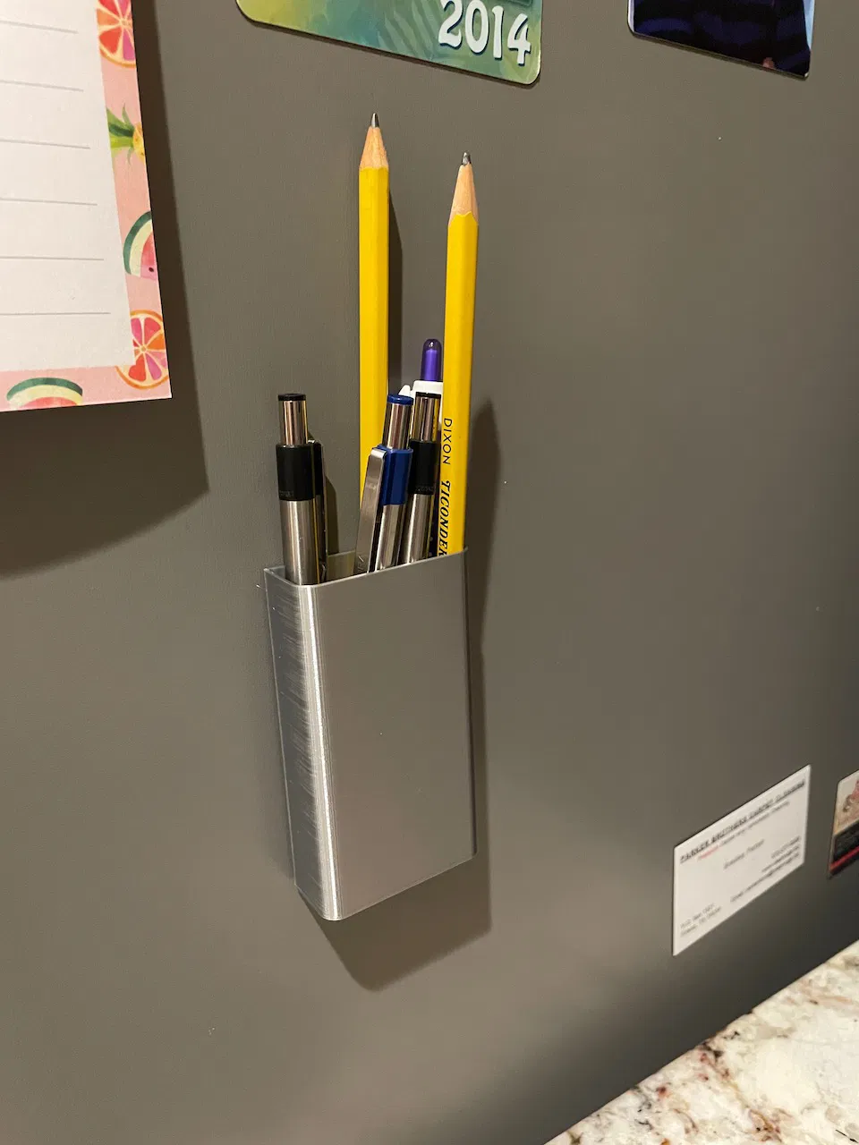 Một cái giá đỡ bút/bút chì nhỏ gọn, có thể gắn bằng nam châm lên tủ lạnh hoặc các bề mặt kim loại khác. Tiện lợi để giữ bút viết gần sổ ghi chú trên tủ lạnh, giải phóng không gian bàn bếp.