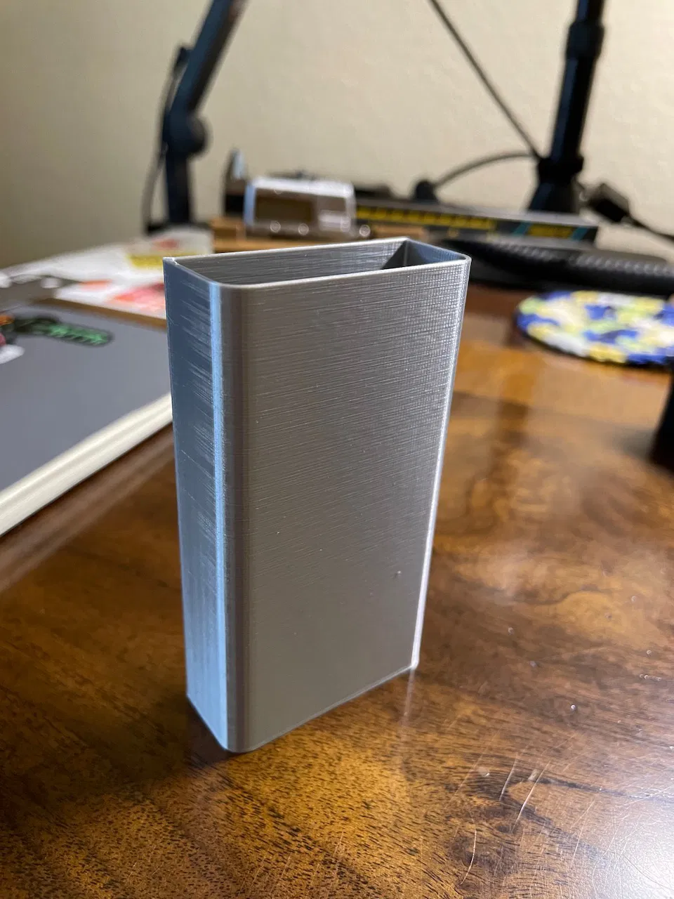 Tụi mình hay dán một cuốn sổ ghi chú nam châm lên hông tủ lạnh để ghi lại danh sách đồ cần mua. Trước đây, tụi mình có một cái cốc đựng bút chì trên bàn bếp, nó hơi vướng víu và thường xuyên cản đường. Cuối cùng, mình nảy ra ý tưởng tạo ra một cái giá đỡ có thể dán lên hông tủ lạnh, kế bên cuốn sổ ghi chú đó. Và đây là kết quả. Kích thước của nó là 50x20x90mm, in mất khoảng 1.5 giờ với đầu phun 4mm ở chế độ Chất lượng 0.2mm.