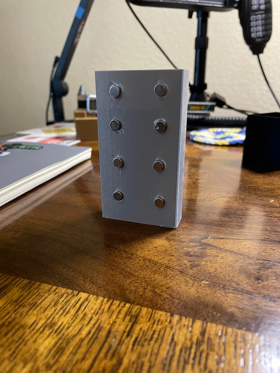 Phía sau có các chỗ lõm nhẹ để đặt nam châm (không phải lỗ xuyên qua). Ban đầu mình có làm một mẫu lớn hơn rồi mới giảm kích thước xuống như bây giờ - dùng 8 viên nam châm là quá dư. Mình đoán 4 viên là đủ nên bạn thử dùng 4 viên trước xem sao, nếu thấy chưa chắc thì thêm sau nhé. Mình dùng loại nam châm 6x2mm này trên Amazon và dán chúng bằng keo Gorilla.
