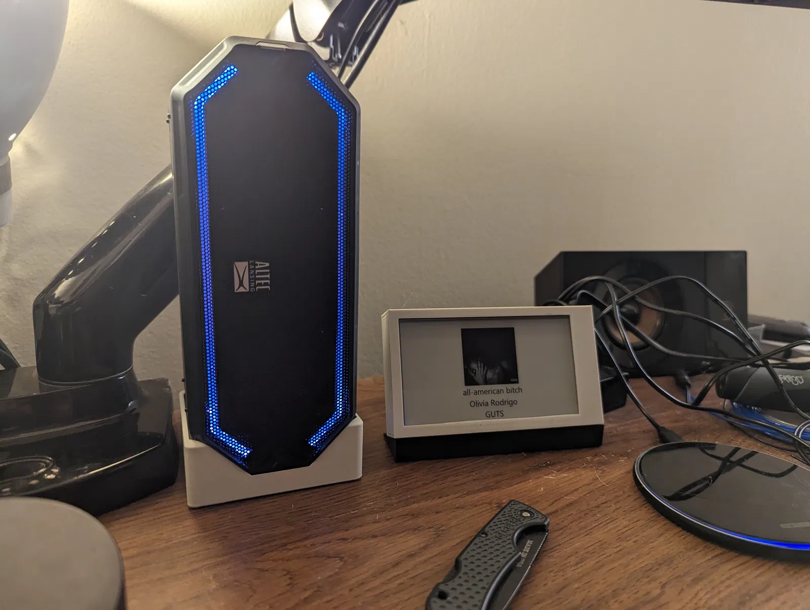 Cái loa này là một anh chàng "nghệ sĩ" đích thực, thích lắc lư nhảy múa trên 4 cái chân nhựa cứng bé tí của nó, làm cho việc giữ nó yên một chỗ trở nên khó khăn. Cái đế này được thiết kế để không ôm khít loa, nhưng vẫn tạo cảm giác như vậy, đồng thời giảm rung đáng kể. Thêm 4 miếng đệm cao su nhỏ ở dưới đáy cũng giúp tăng cường khả năng giảm rung này.