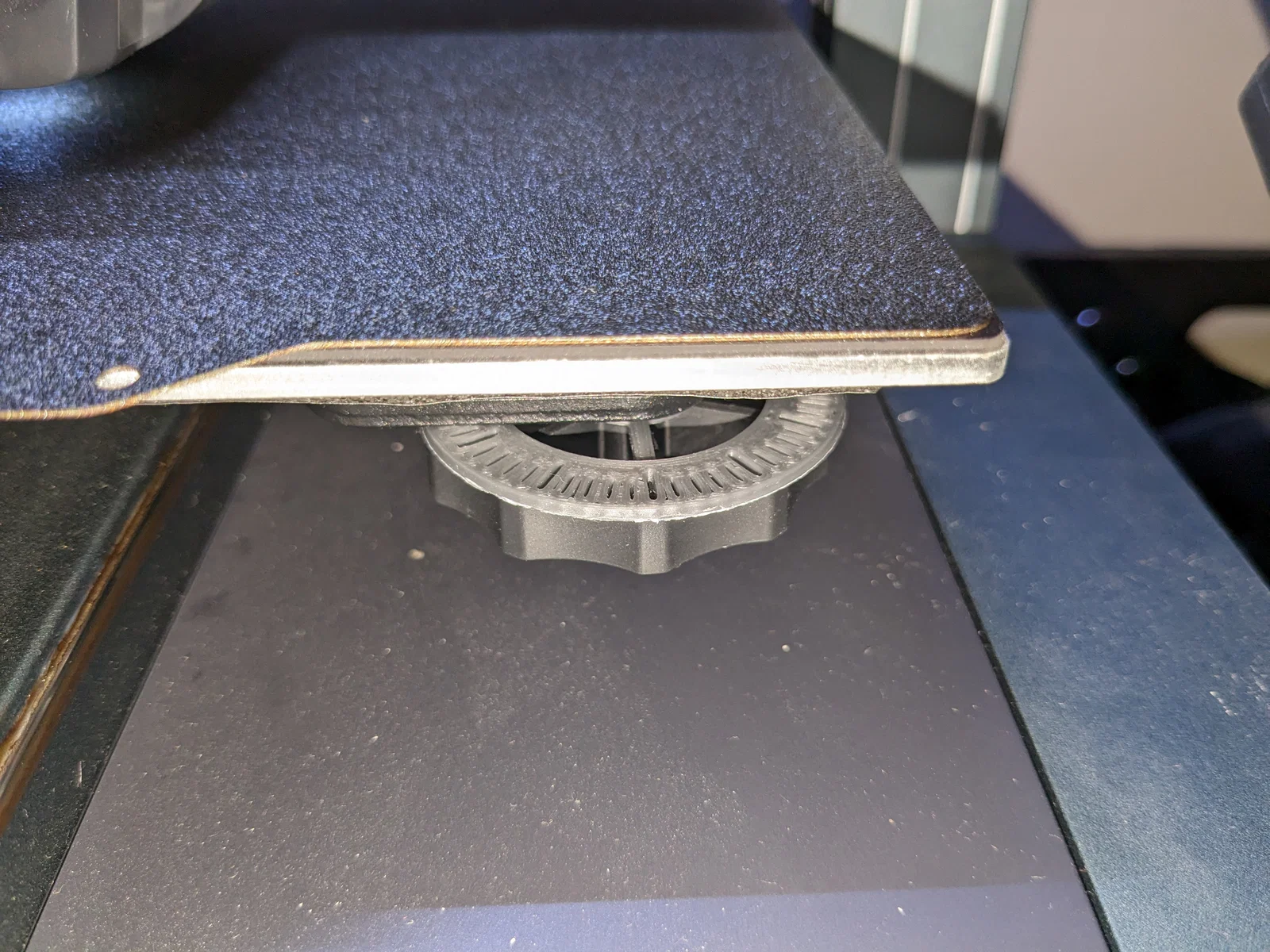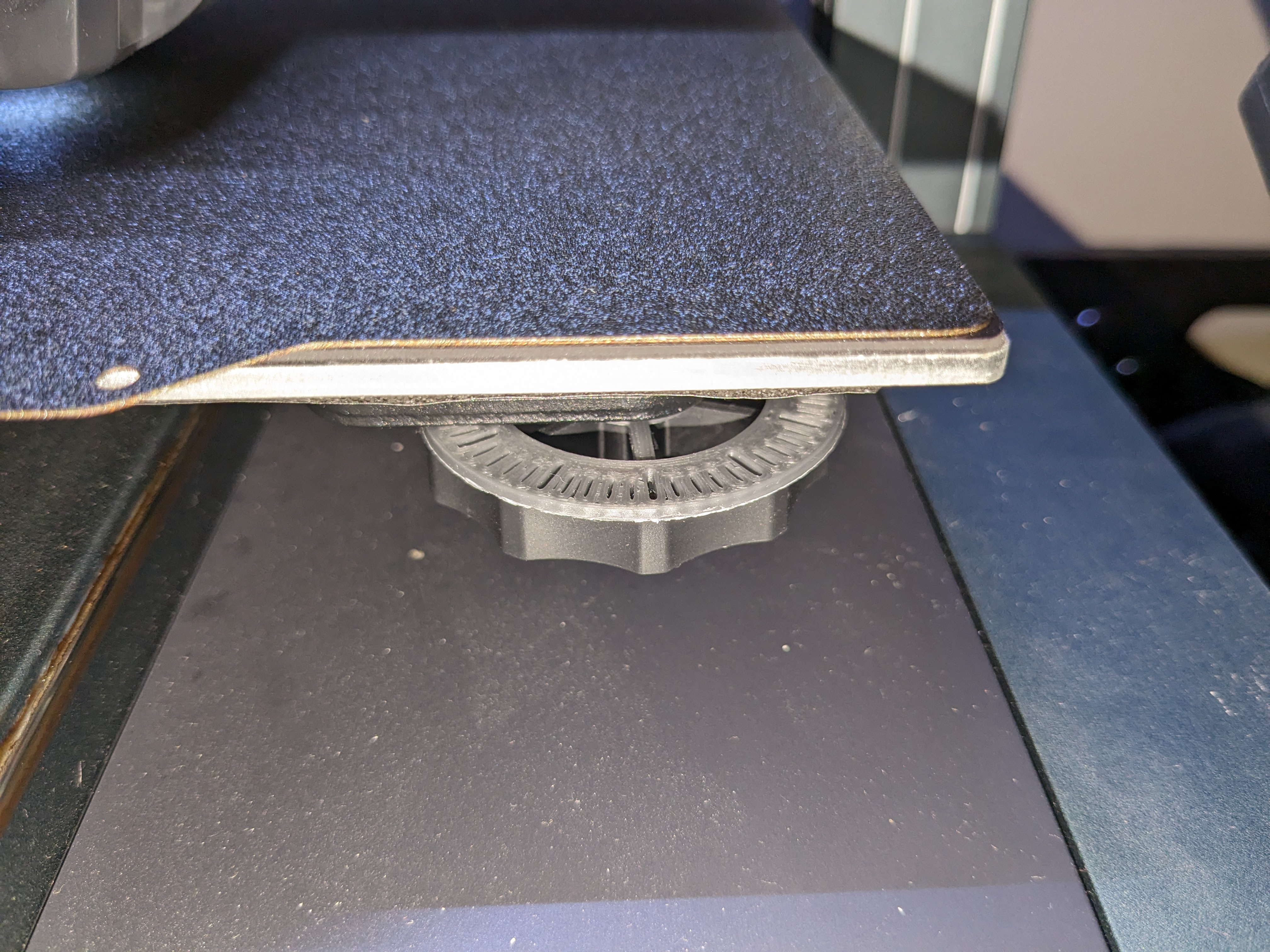 Đây là một hướng dẫn đơn giản để điều chỉnh các núm cân bàn ủi cho các điều chỉnh được tính toán độ nghiêng của vít. Hướng dẫn này đặt trên đỉnh các núm và vừa vặn xung quanh phần nhựa nơi vít đi qua. Tôi căn chỉnh các "nan hoa" của núm máy in và hướng dẫn để chúng chồng lên nhau, sau đó giữ hướng dẫn khi tôi sử dụng nan hoa của máy in làm tham chiếu về mức độ xoay.