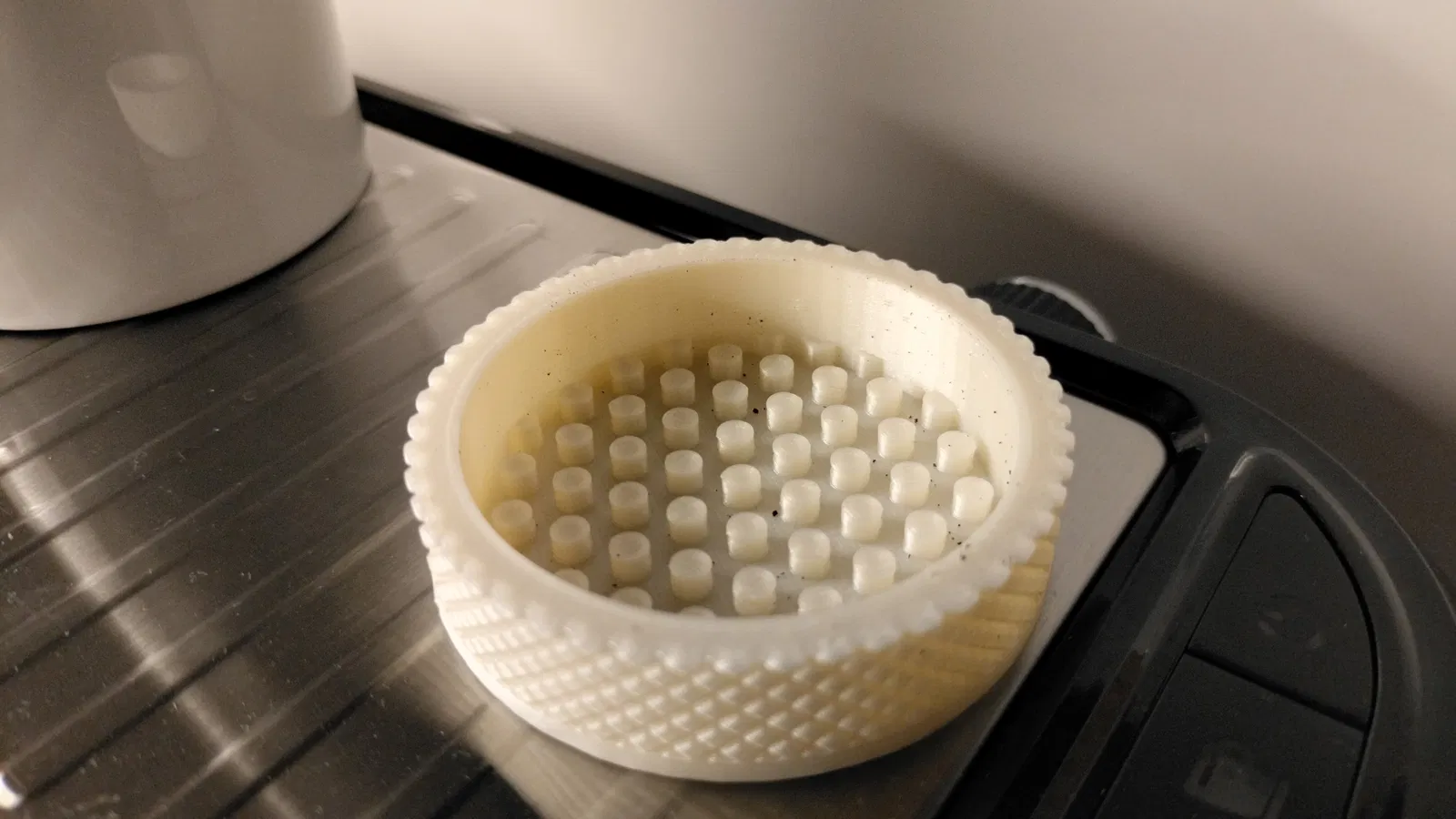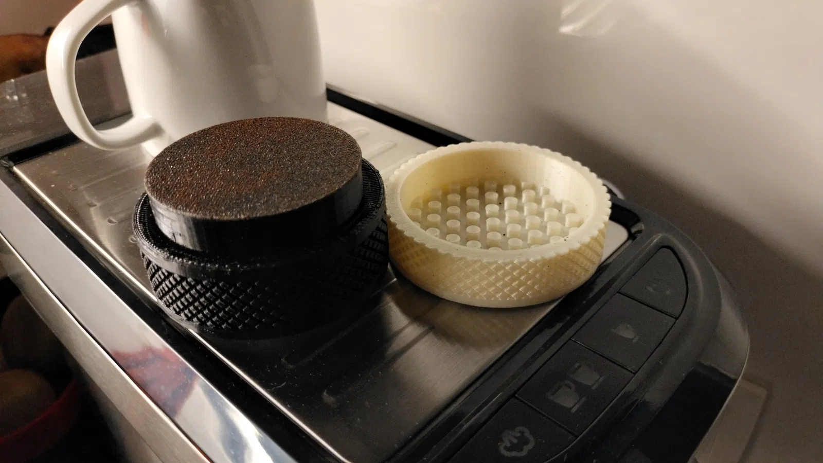 Bộ dụng cụ bao gồm dụng cụ ép (tamper) và phân phối cà phê cho máy espresso đường kính 51mm, kèm theo máy xay tiện lợi để lưu trữ và vệ sinh.