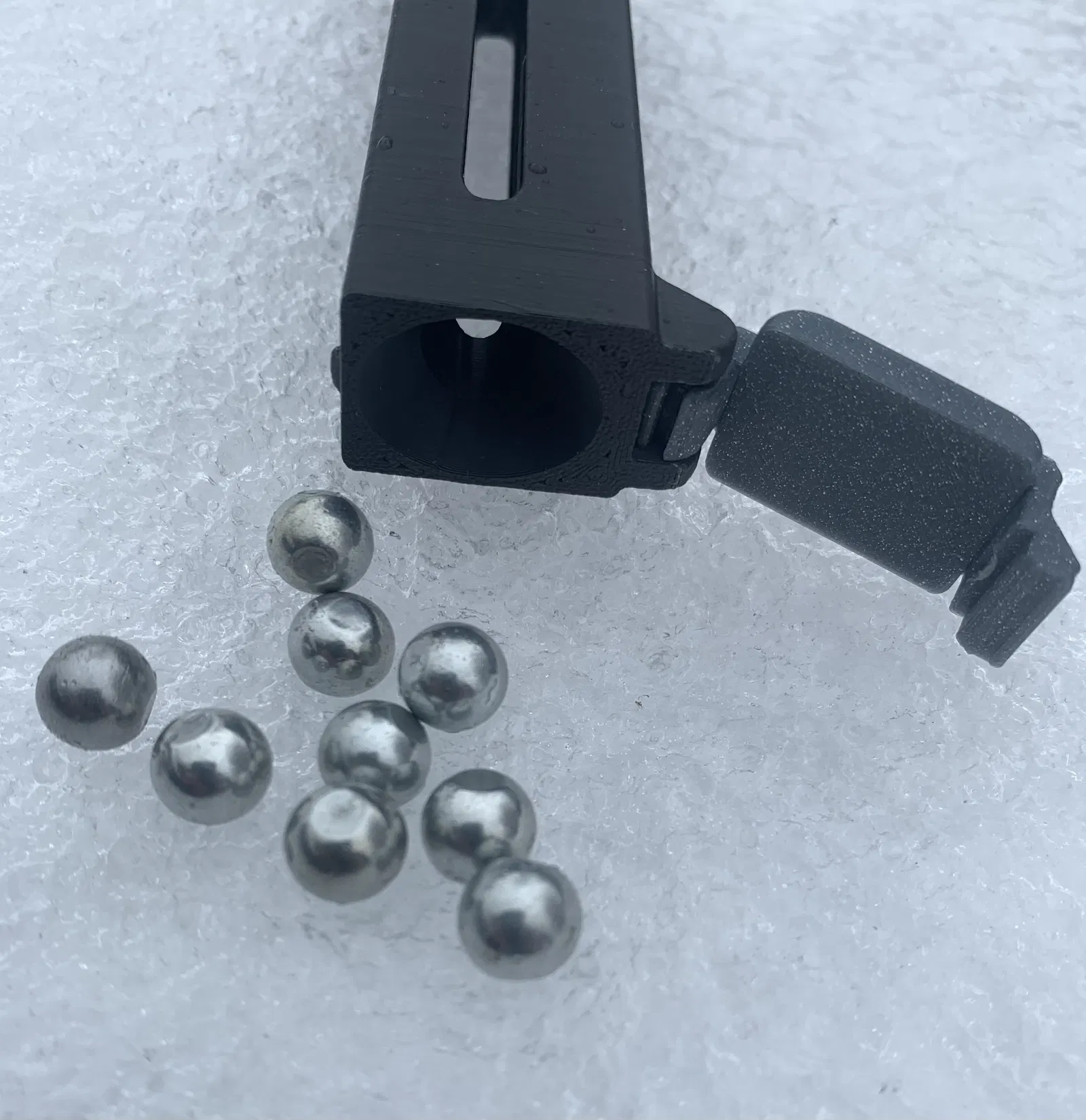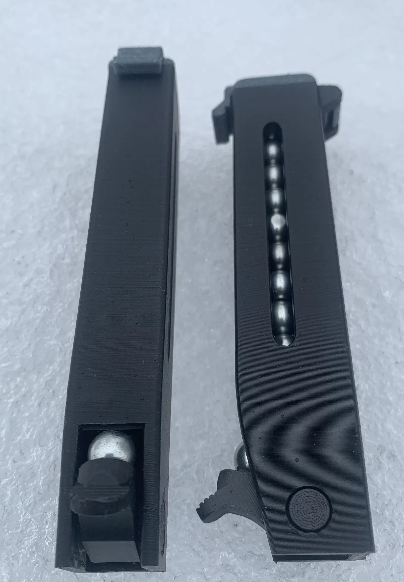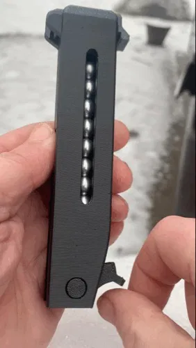 Kẹp đạn ná cao su này có thể giữ và thả 12 viên bi thép 3/8" (9.5mm). Bao gồm hai loại bao đựng: một hướng ra trước và một hướng ra hông. Cần thêm một nam châm đất hiếm 5/16" (8mm) x 1.8mm.