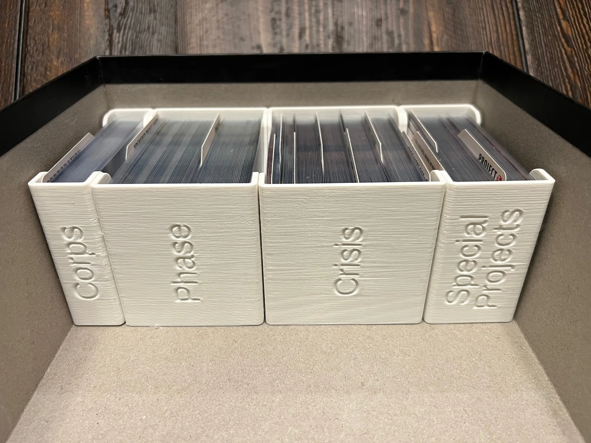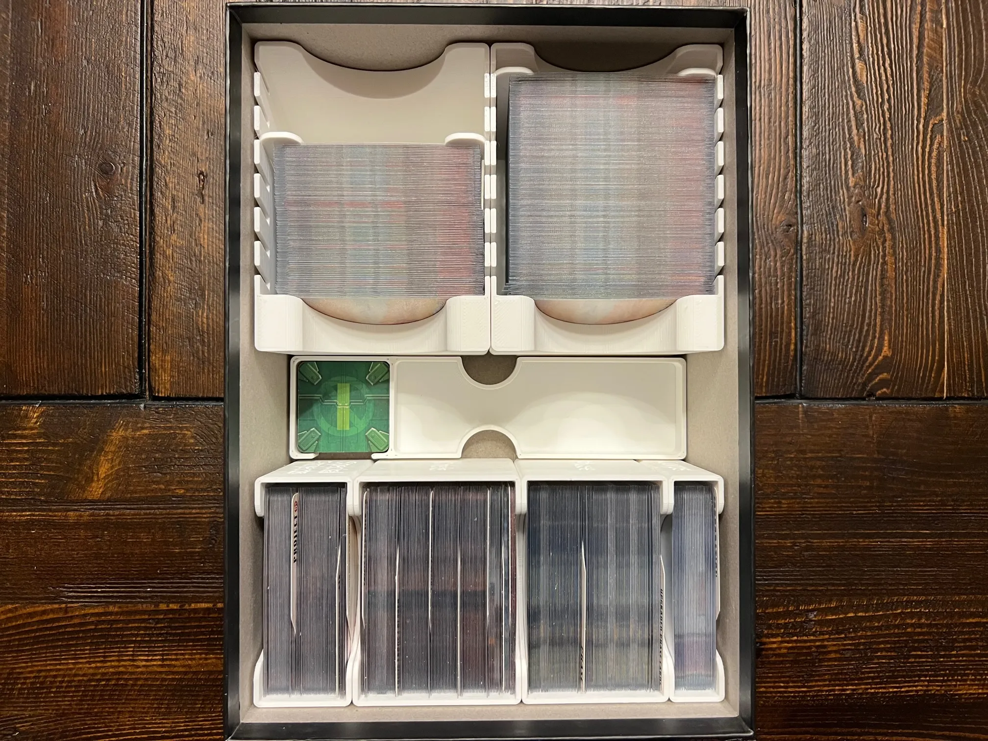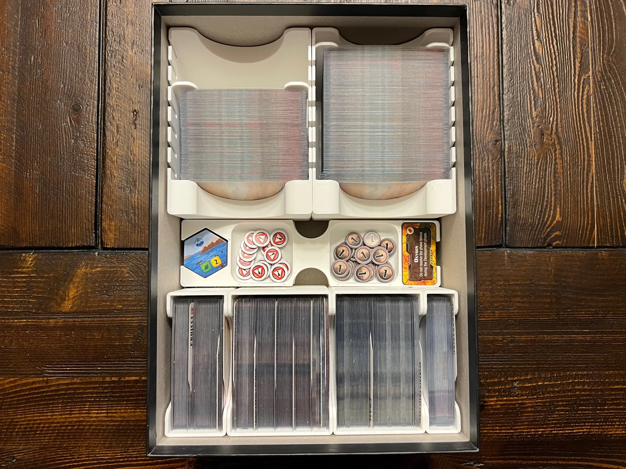 Để đạt được việc chèn như đã trình bày, hãy in hai khay thẻ dự án và các vách ngăn, hai khay MegaCredit và token rừng, hai khay 3VP và thẻ, và một cái cho mọi thứ khác.
