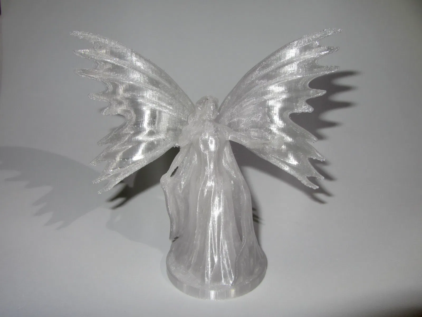 Cái Nữ Hoàng Tiên của MZ4250 có mấy cái đầu cánh không thể in bằng máy FDM được. Tôi đã chỉnh sửa lại mấy cái đỉnh cánh trong Blender cho nó dày lên. Bằng cách in ở tỉ lệ 200% (chiều cao 116 mm) thì có thể in được mẫu này bằng máy FDM. Nữ Hoàng Tiên trong ảnh được làm bằng máy Creality Ender-3 V2 với sợi AzureFilm PETG Transparant. Các cài đặt trên Cura slicer bao gồm: tỉ lệ 200%, Layer Height 0.2 mm, Layer Width 0.45 mm, số dòng Wall 2, 4 lớp Top, 3 lớp Bottom, mật độ Infill 15%, kiểu Infill Grid, Support Flow 95%, Fan 10%, Support dạng Cây, góc Support Overhang 60 độ, mật độ Support 10%, chọn "Remove All Holes". Tôi chọn quạt 10%, vì tôi muốn độ bám dính giữa các lớp thật tốt cho phần cánh tay. Độ bám dính giữa các lớp rất tốt, nên có thể tăng tốc độ quạt lên để cho chi tiết sắc nét hơn. Bằng cách chọn "Remove All Holes" trong Cura slicer, phần bên trong không nhìn thấy sẽ không được in ra mà thay vào đó được lấp đầy bằng infill. #### Cảm ơn nhiều Xin gửi lời cảm ơn chân thành đến MZ4250 vì đã chia sẻ mẫu này miễn phí kèm theo file Blender với giấy phép CC BY.