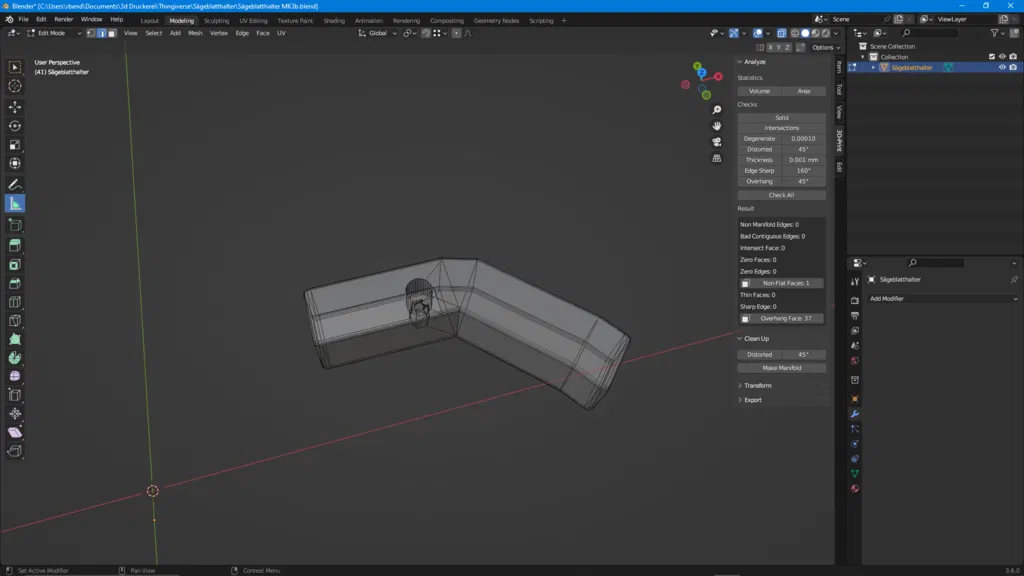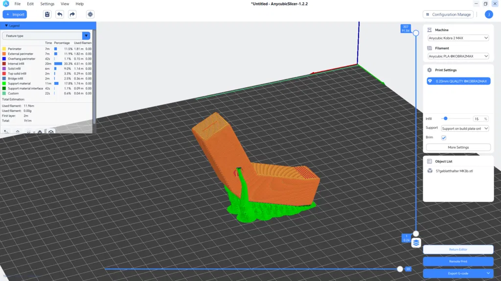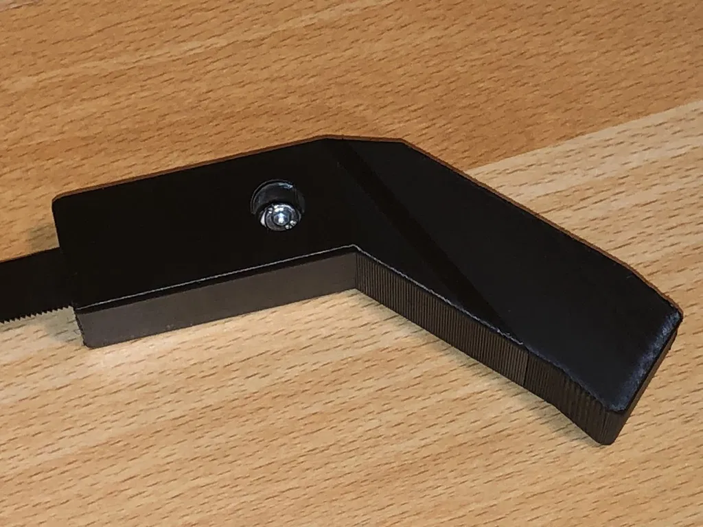 1 screw M4x10 1 washer M4 1 M4 nut 1 metal saw blade ;) I kept the handle relatively upright in the slicer so that I could print the opening for the saw blade more cleanly. Although 2 meters of filament are still needed for support, there is almost no rework required.
