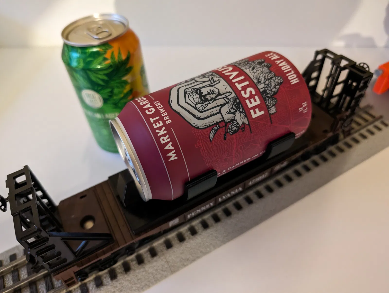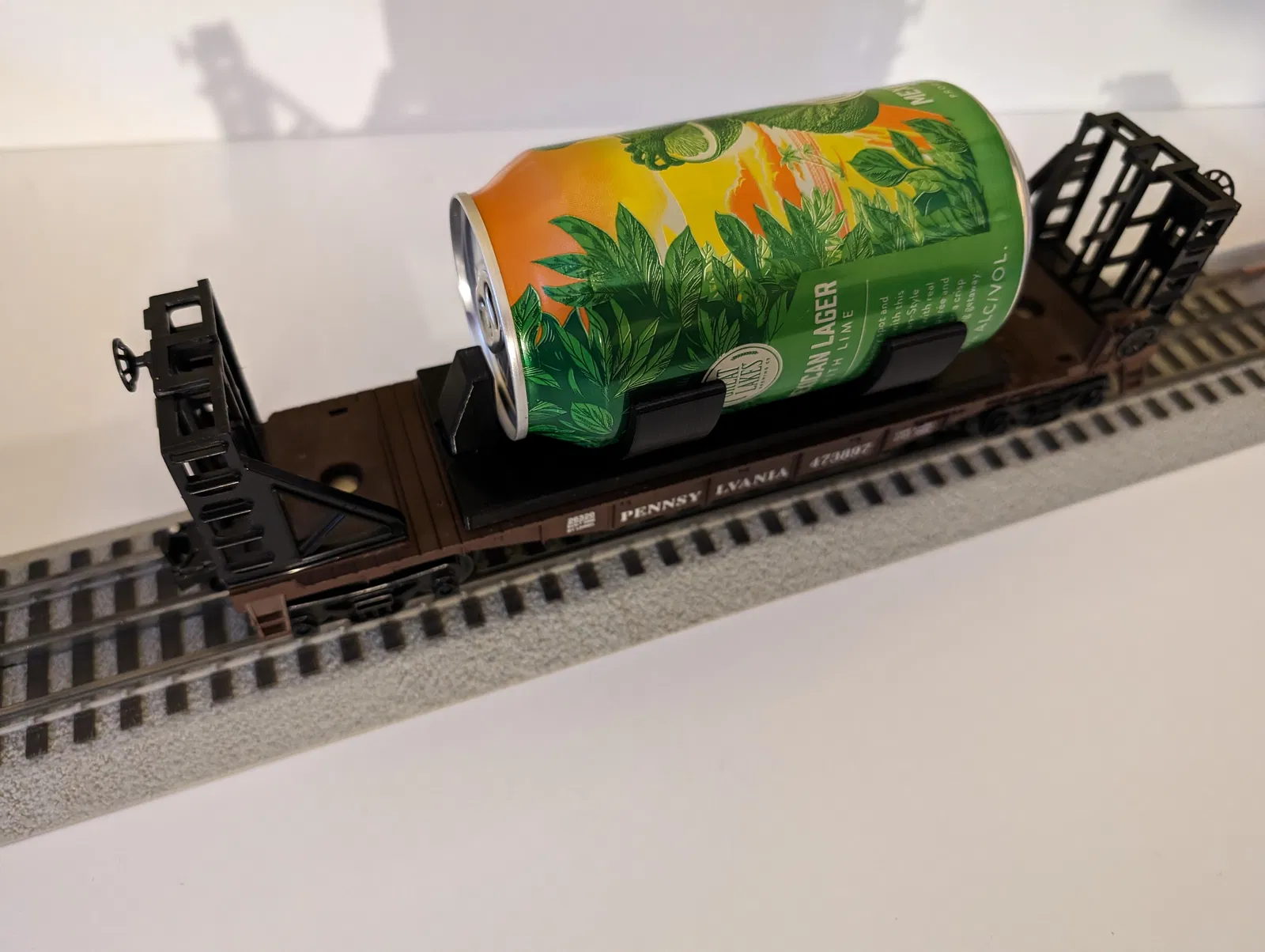 Cái giá đỡ này gắn vô toa xe phẳng O scale của Lionel, giống như chiếc Pennsylvania 473897 chụp hình đó, bằng cách dùng mấy cái lỗ cắm cọc. Nó sẽ chở được một lon nhôm tiêu chuẩn 12 oz.