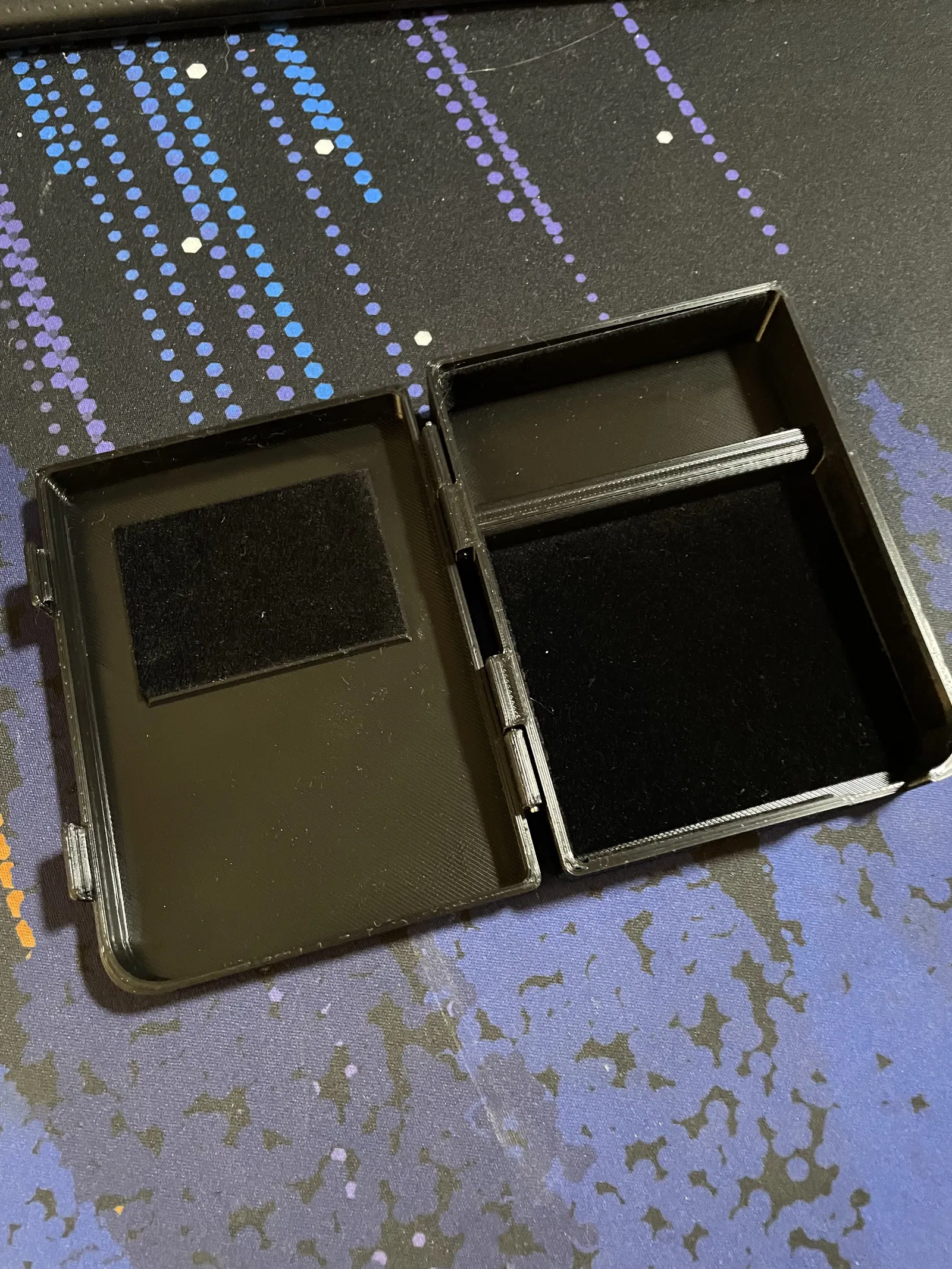 Mô tả vỏ bấm gài (snap case) cho Miyoo Mini Plus. Sản phẩm này được thiết kế để sử dụng kèm lớp lót nỉ, tạo cảm giác vừa vặn, ôm sát. Bản lề được làm từ đinh ghim dây Wire Brads, ép chặt vào vỏ.