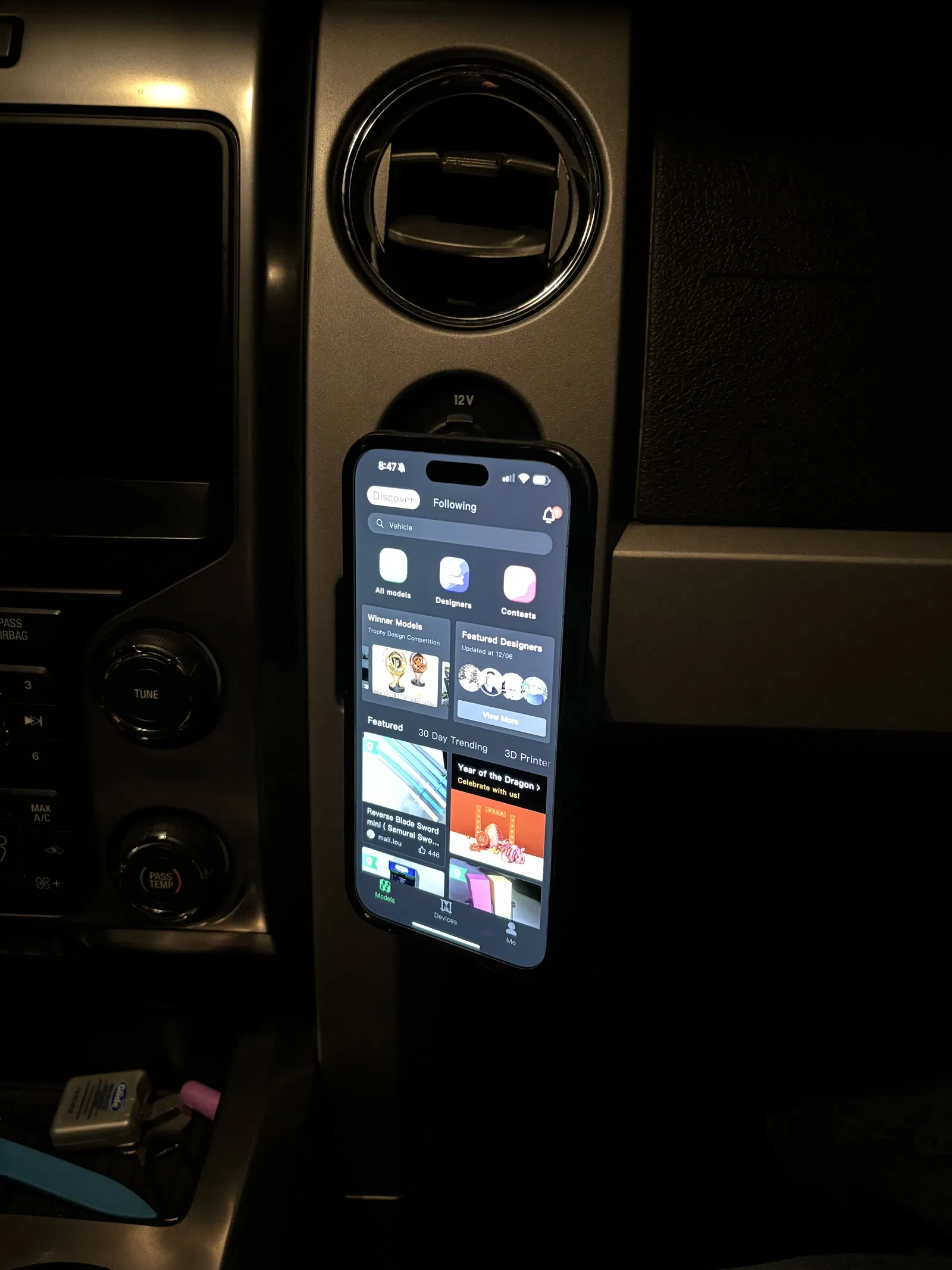 Gắn vừa cho Ford F-150 2009-2014 và Lincoln Mark LT 2010-2014. Một đế nam châm đơn giản tận dụng hộc chứa đồ ít dùng tới. Nó lẫy vào giữa hộc chứa đồ và bảng điều khiển. Có thể cần chút lực để mở hé khe. Mình in bằng PAHT-CF trên máy x1c. In không cần support. Dùng bất kỳ sợi nhựa nào chịu được nhiệt độ trong xe.