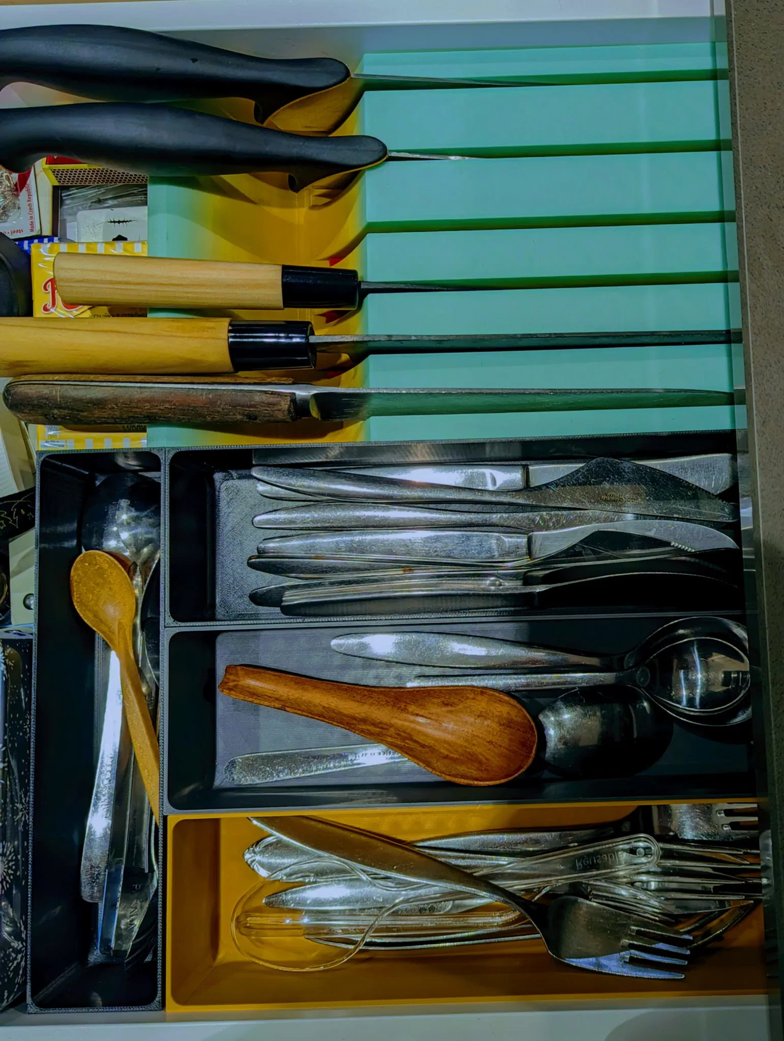 Khay đựng dao nĩa in 3D tối ưu hóa không gian, chia thành khu vực dao, dao nĩa và dụng cụ (đang phát triển). Thiết kế vừa vặn ngăn kéo 373mm, tăng dung lượng so với khay IKEA.