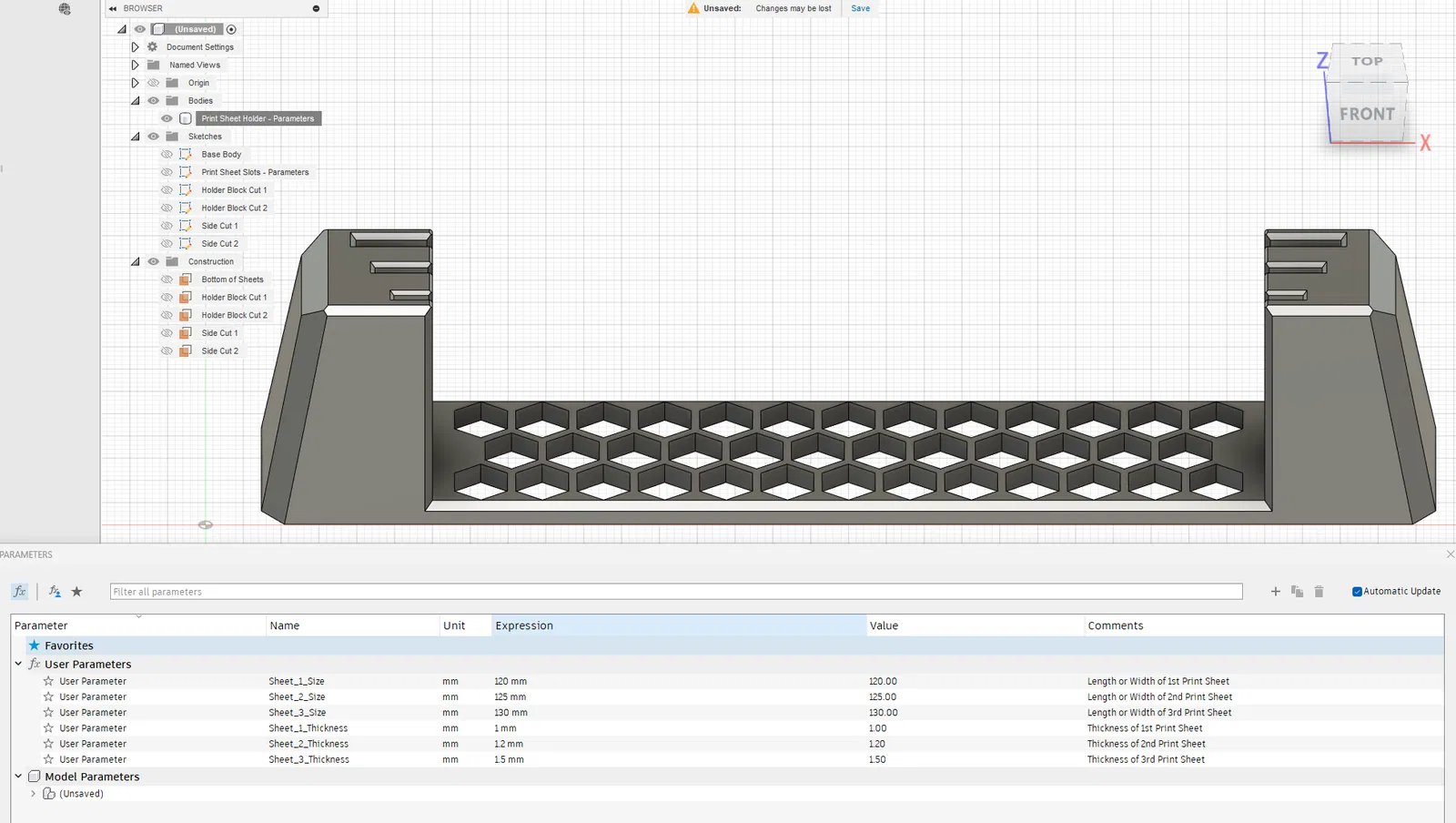 Kẹp giữ tấm in cho các dòng máy Voron V0. Có thể giữ 3 tấm in với kích thước và độ dày tùy chỉnh. Tích hợp tham số trong file Fusion giúp dễ dàng thay đổi theo nhu cầu sử dụng.