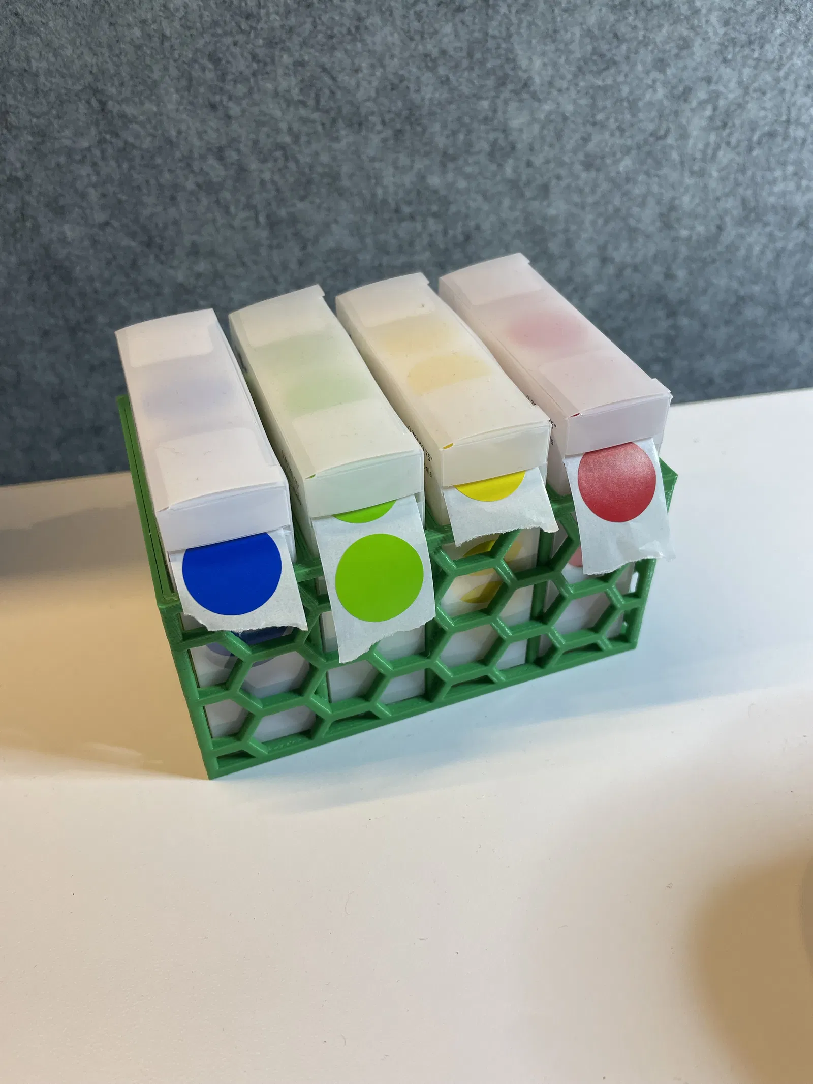 Hộp đựng cuộn sticker hiệu Parlaim 0.75" vừa vặn với hộp gốc. Giúp bàn làm việc gọn gàng, lý tưởng cho QC hoặc công việc dán nhãn. Có loại 4 hoặc 5 ngăn. In không cần support. Thiết kế bởi TinkerCAD.