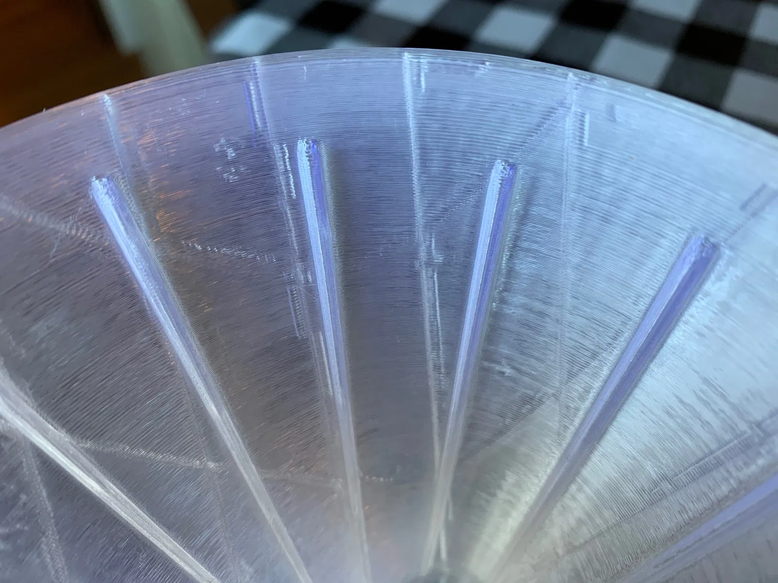 Ảnh của tôi là bản in nhanh trong 4 giờ với PLA trong suốt - chỉ sử dụng 2 lớp ngoài, 2 lớp trên và dưới, và 5% độ đặc ruột (grid).