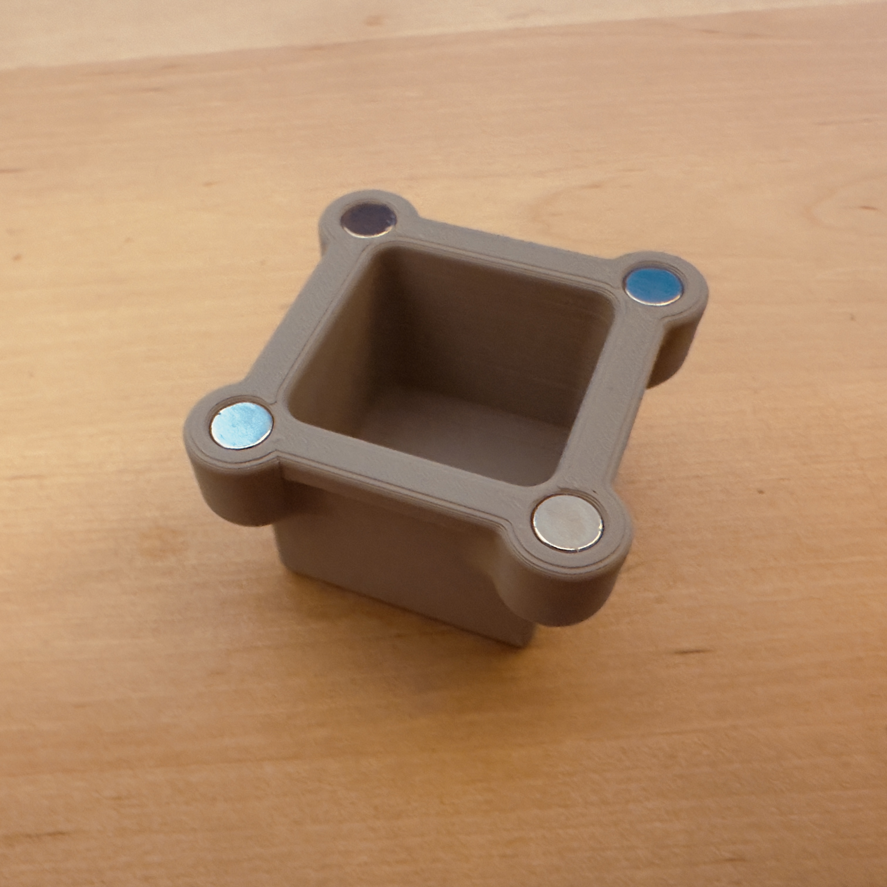 Một chiếc hộp nam châm cực kỳ đơn giản, có tích hợp sẵn nam châm đất hiếm. Kích thước bên trong 1x1x1 inch, nam châm đường kính 6mm, sâu 3mm, được thiết kế để gắn chặt bằng lực ép. In trực tiếp không cần chỉnh sửa.