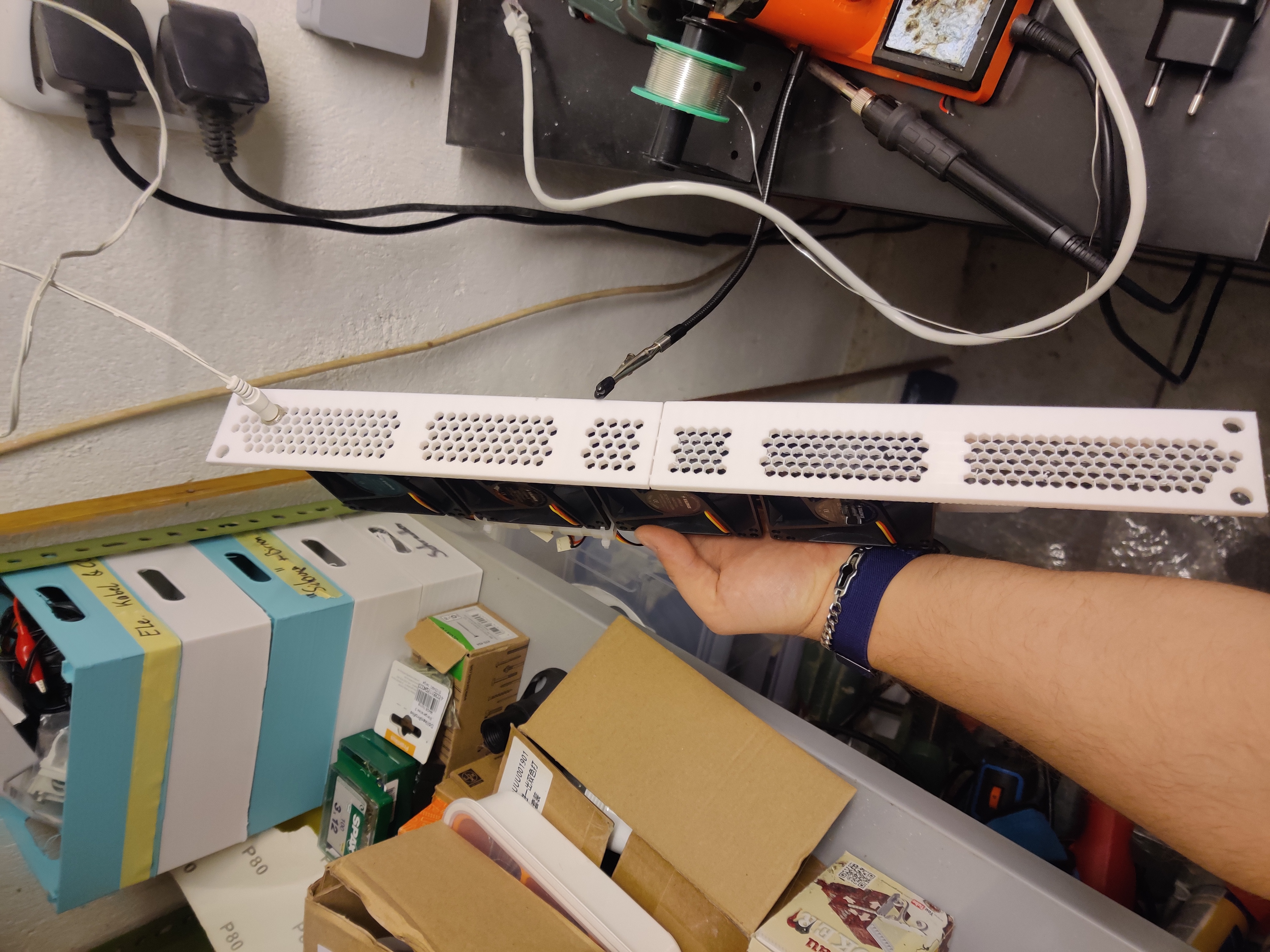 Tại vì ba cái não của tui không xử lý nổi vụ canh lỗ gắn quạt cho chuẩn, nên tui khoan lỗ sau khi in và dùng ốc đi kèm quạt luôn.