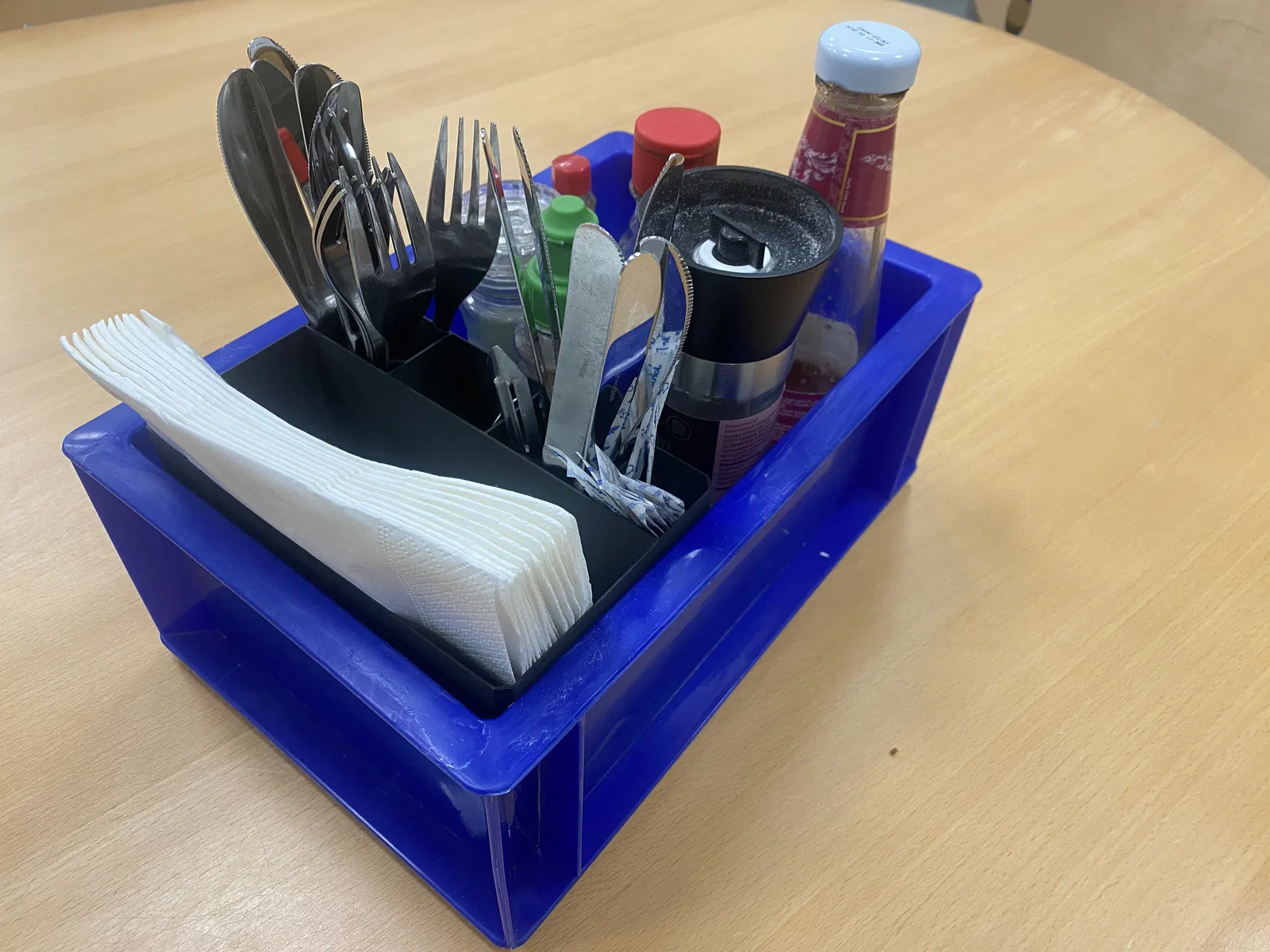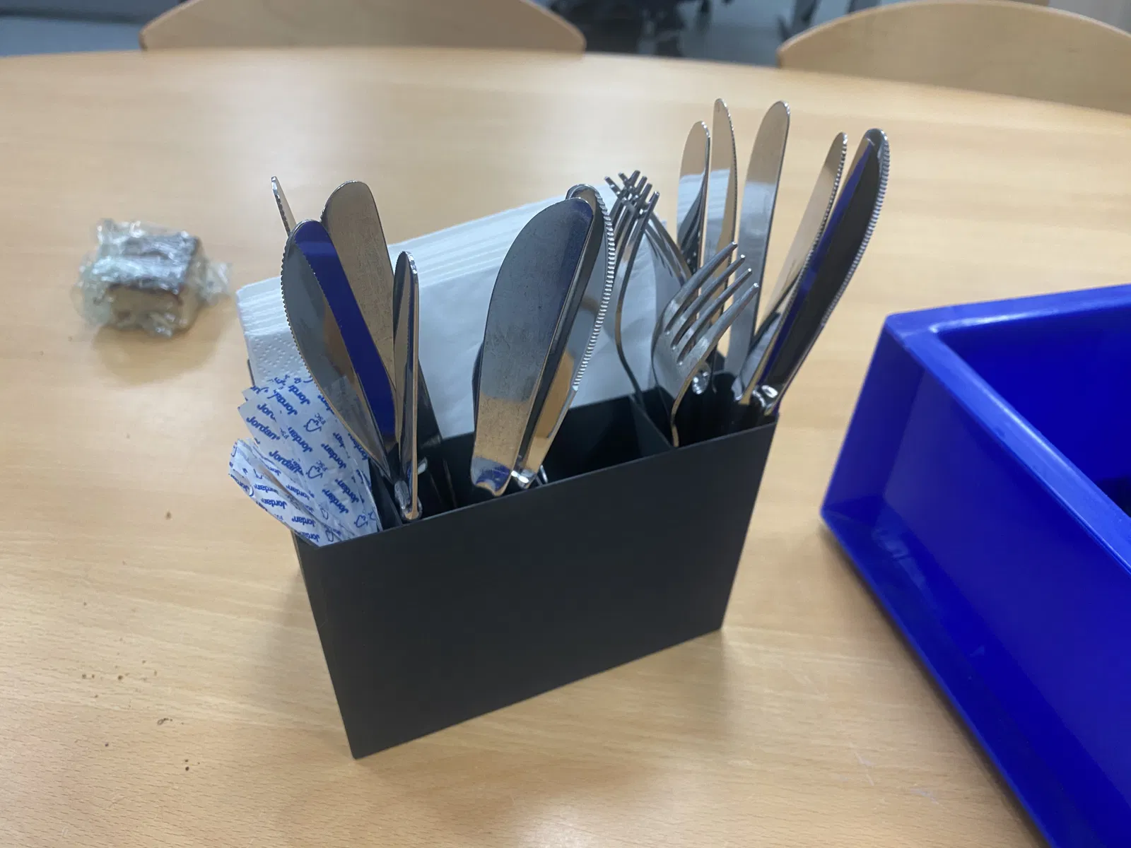 Hộp đựng đồ đơn giản cho dao nĩa và khăn ăn trên bàn làm việc. Có ngăn nông để lấy tăm. Thiết kế này giúp giữ cho bàn làm việc gọn gàng và sẵn sàng cho các cuộc họp sau bữa trưa.