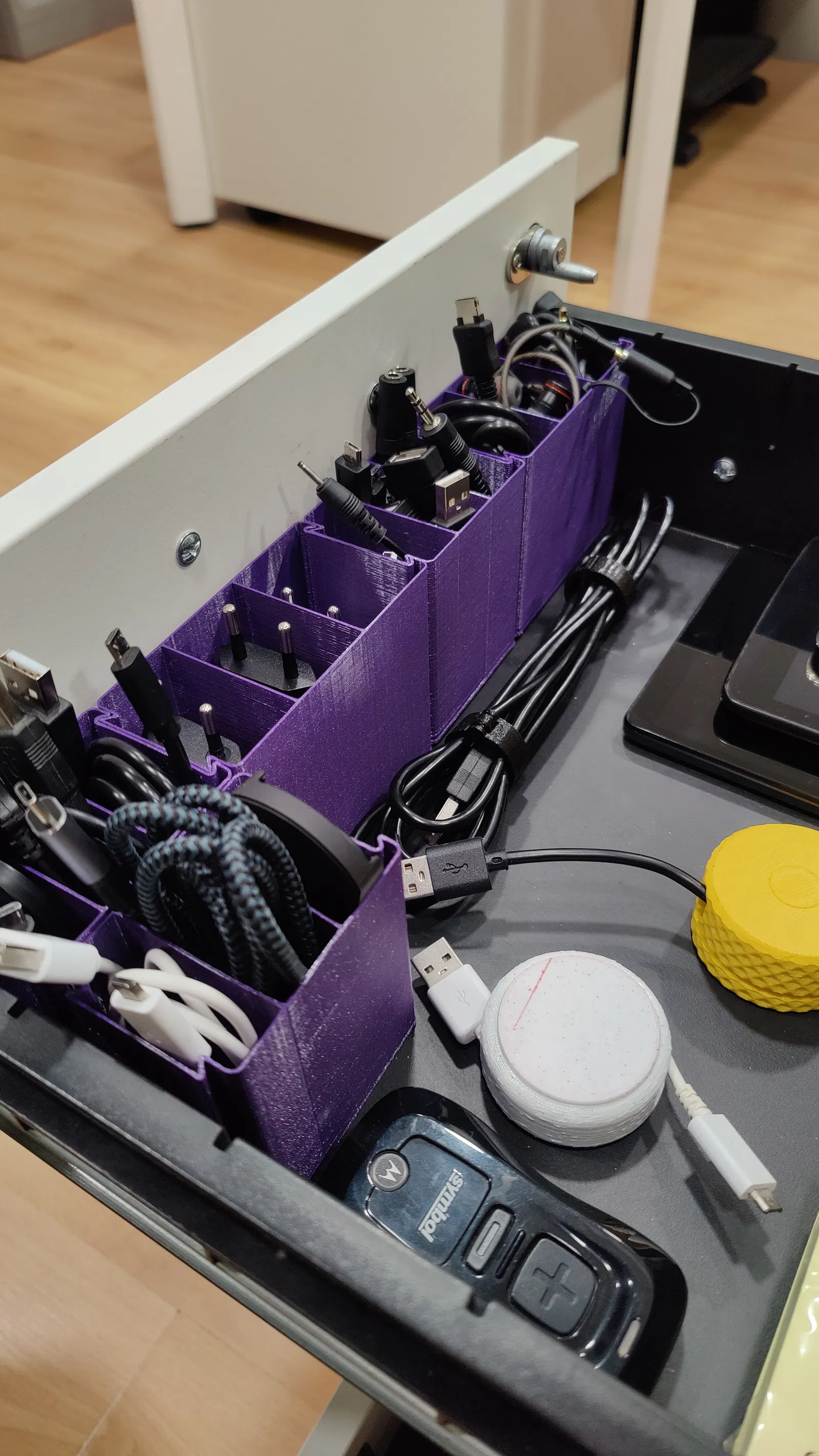 Bộ tổ chức dây cáp có thể xếp chồng lên nhau. Sản phẩm này có 3 ngăn tích hợp trong một khối duy nhất, giúp bạn quản lý dây cáp gọn gàng hơn trong ngăn kéo hoặc trên bàn làm việc. Chất liệu PLA là lựa chọn phổ biến cho các mô hình in 3D tiện ích như thế này.