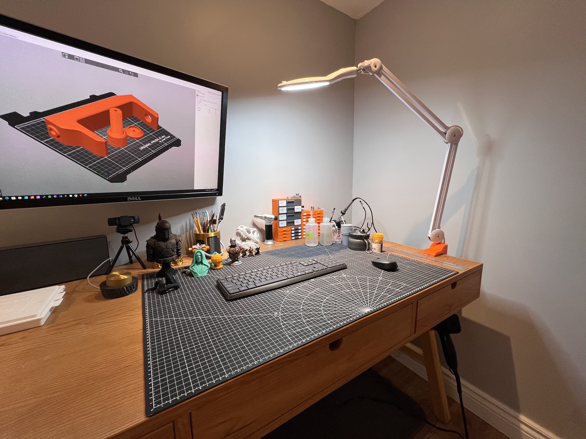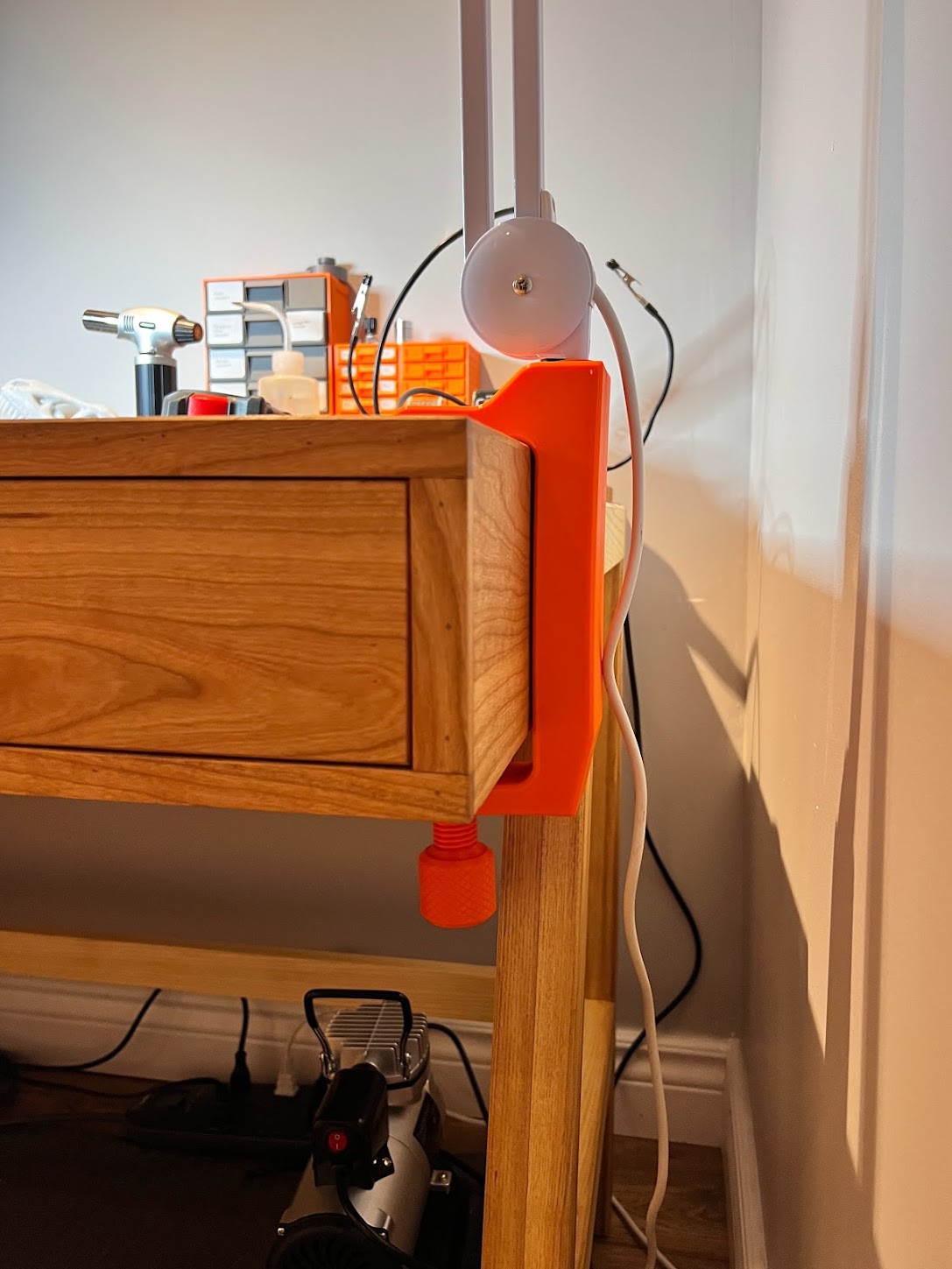 Dạo gần đây tui mới đóng cho mình cái bàn làm đồ thủ công bự hơn, có mấy cái ngăn kéo để chứa đồ nghề vẽ vời các thứ. Vừa mới làm quen với việc sắp xếp đồ đạc sao cho hợp lý khi sử dụng nhiều hơn, tui không muốn gắn đèn bàn cố định vô bàn luôn. Cái khó là tui không kiếm được cái kẹp nào cho đèn bàn mà đủ bự cho cái bàn của tui.