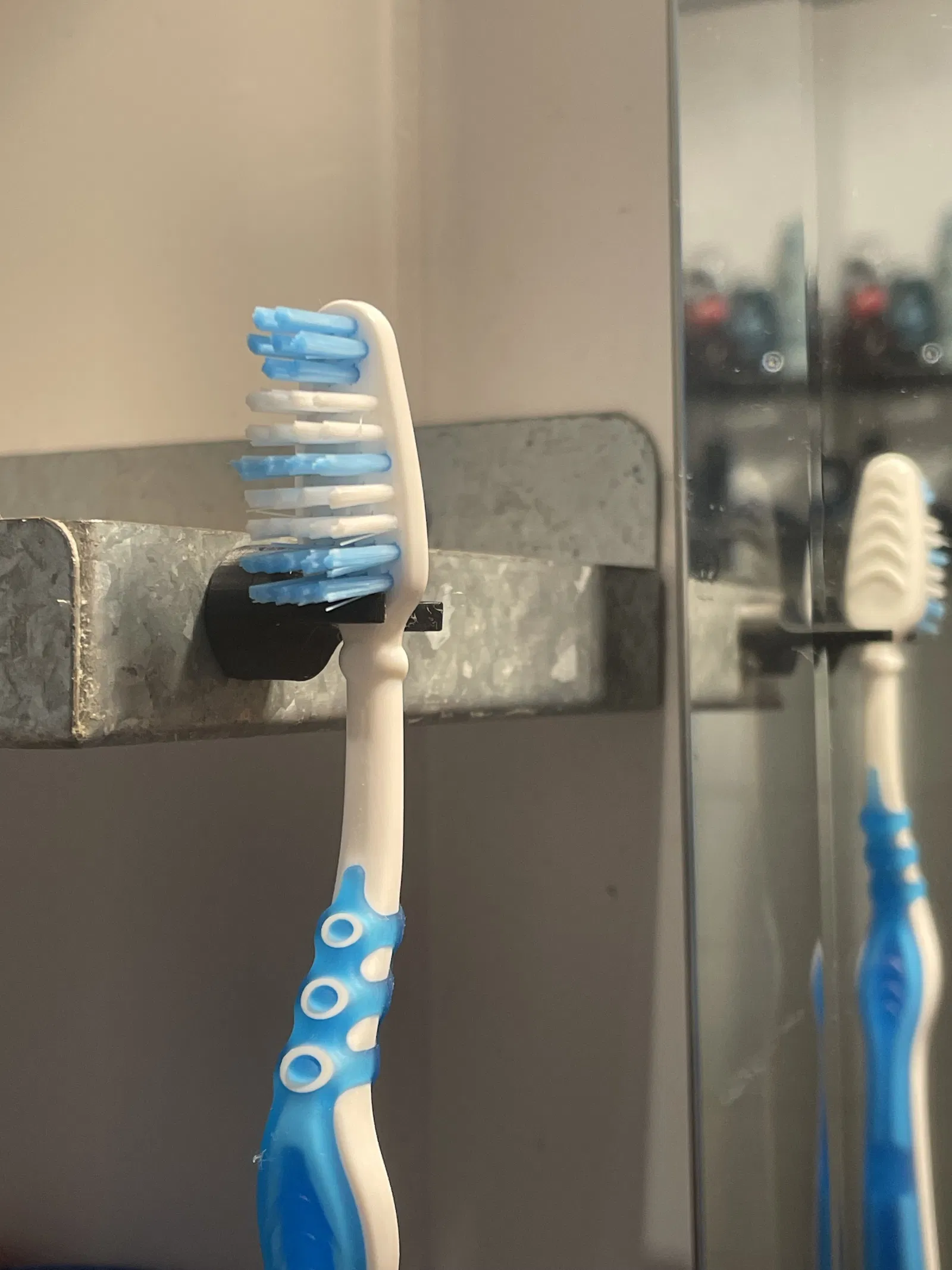 Tui có làm một cái đế cắm bàn chải đánh răng đơn giản, phía sau có chỗ gắn vừa vặn cục nam châm (kích thước 10x5mm). Bạn có thể dễ dàng tìm mua cục nam châm này trên Aliexpress với giá chỉ vài xu thôi nha.