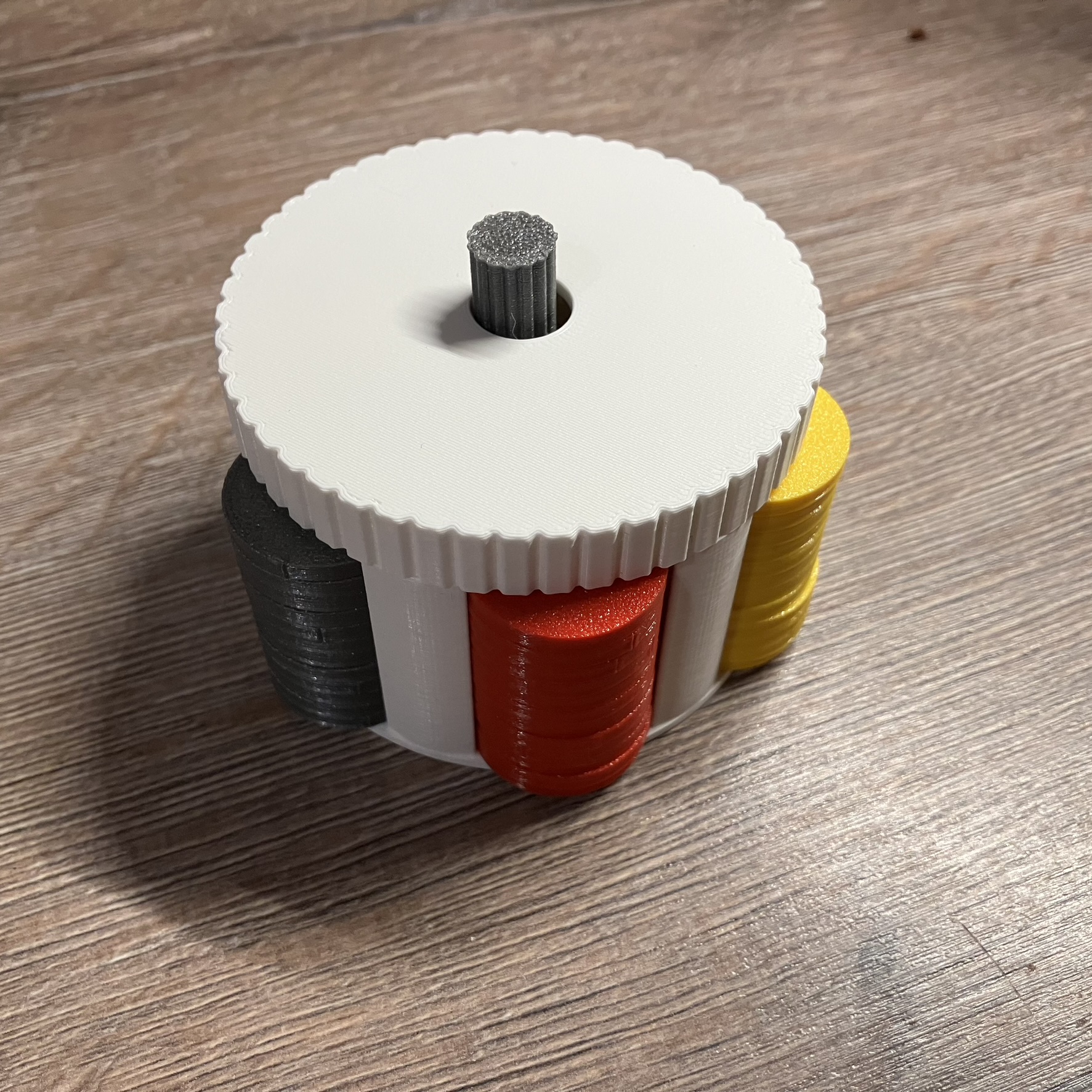Camburina, trò chơi vui nhộn cho cả gia đình (2-6 người chơi). In một con quay "xúc xắc", 6x12 quân cờ và hộp có nắp vặn.