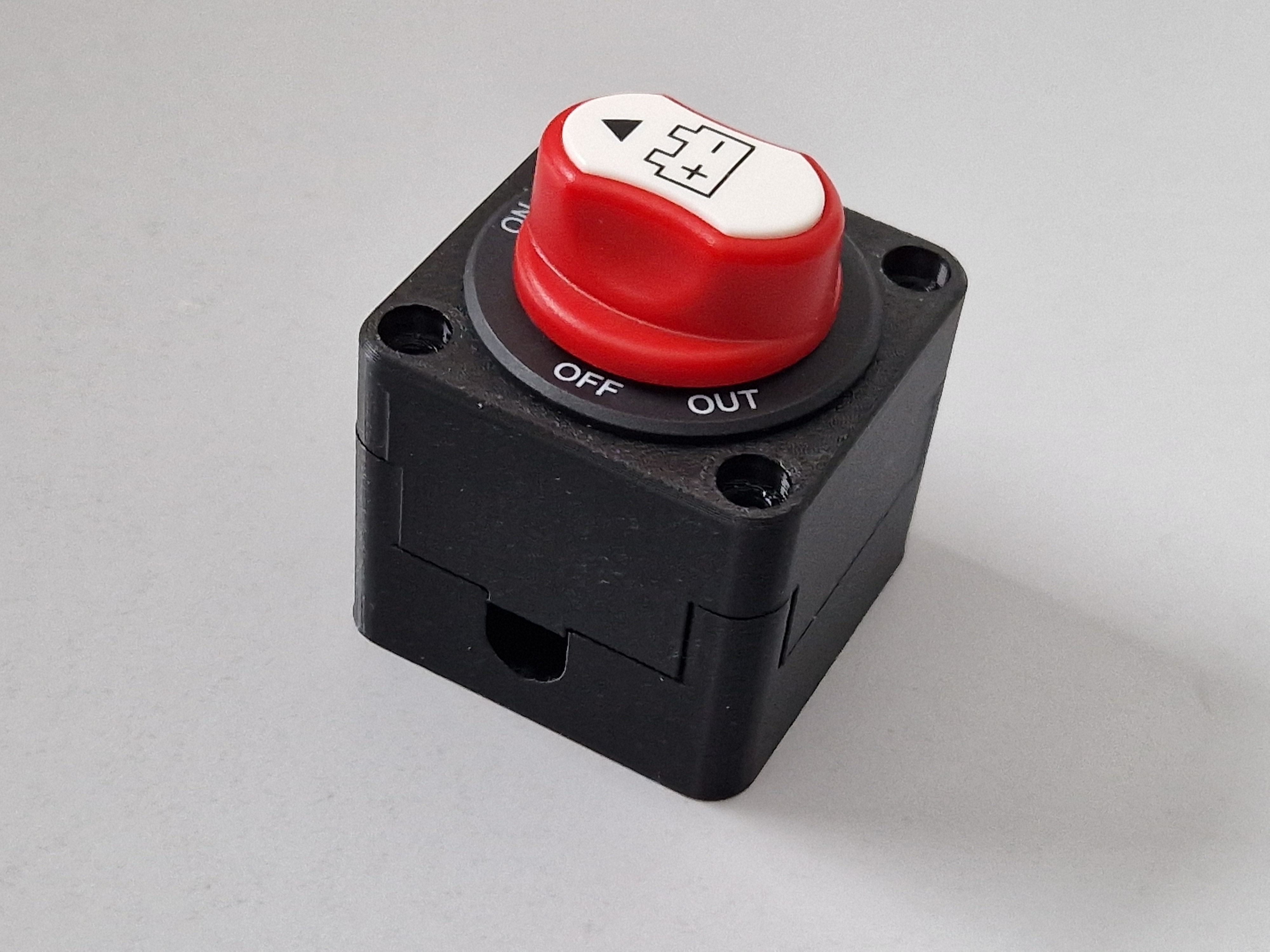 Vỏ hộp hai mảnh dành cho công tắc cách ly pin Jtron, cho phép lắp trực tiếp vào cáp pin. Yêu cầu 4 vít M4x16 để lắp ráp và hai vít để gắn đế. Nên in bằng PETG, đặc biệt là Prusament PETG V0. Có tay cầm dự phòng kèm theo.
