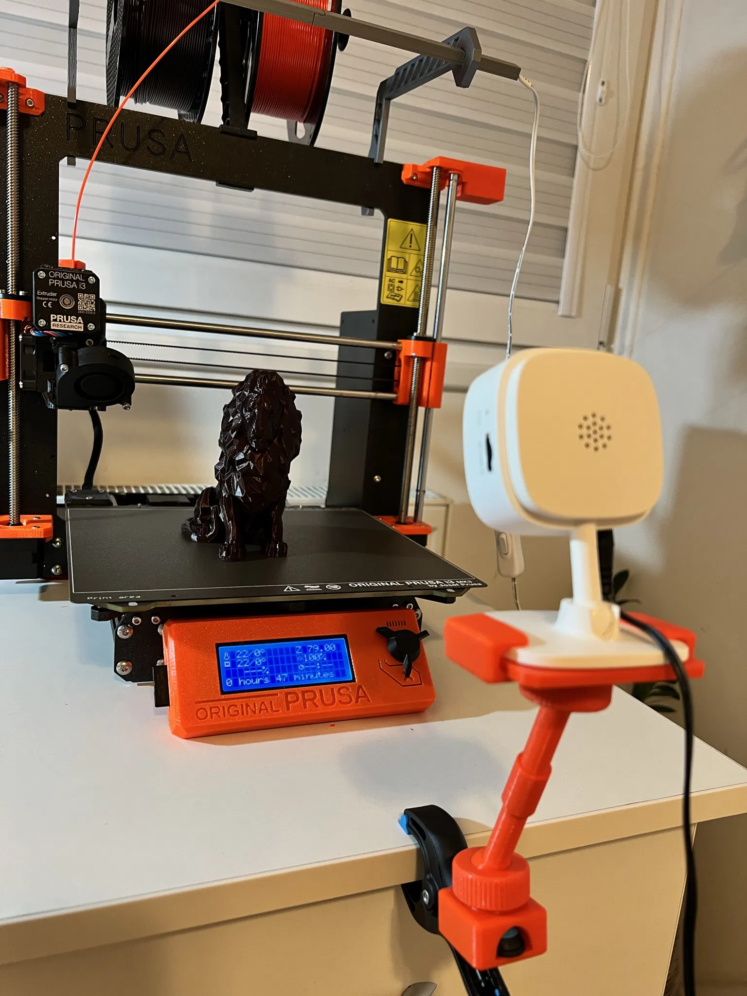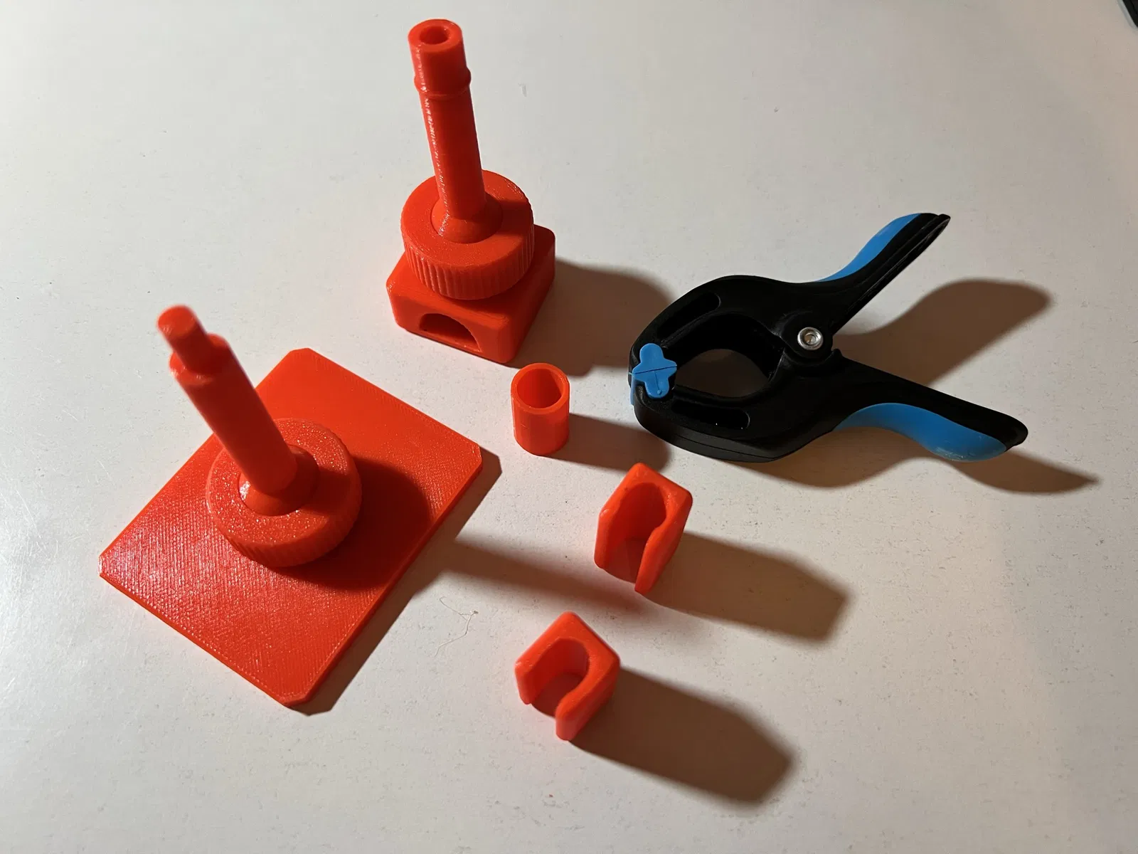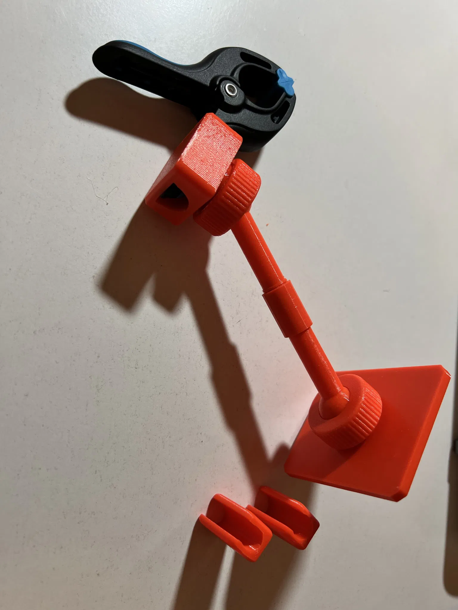Giá đỡ khớp nối được sửa đổi để lắp vào kẹp XTline 8 cm. Khớp nối trên thanh được gia cố bằng con lăn bao. Tùy chỉnh lỗ trên bộ phận dưới cho phù hợp với kẹp của bạn. (Tinkercad) Camera được cố định trên bảng bằng hai kẹp cố định.