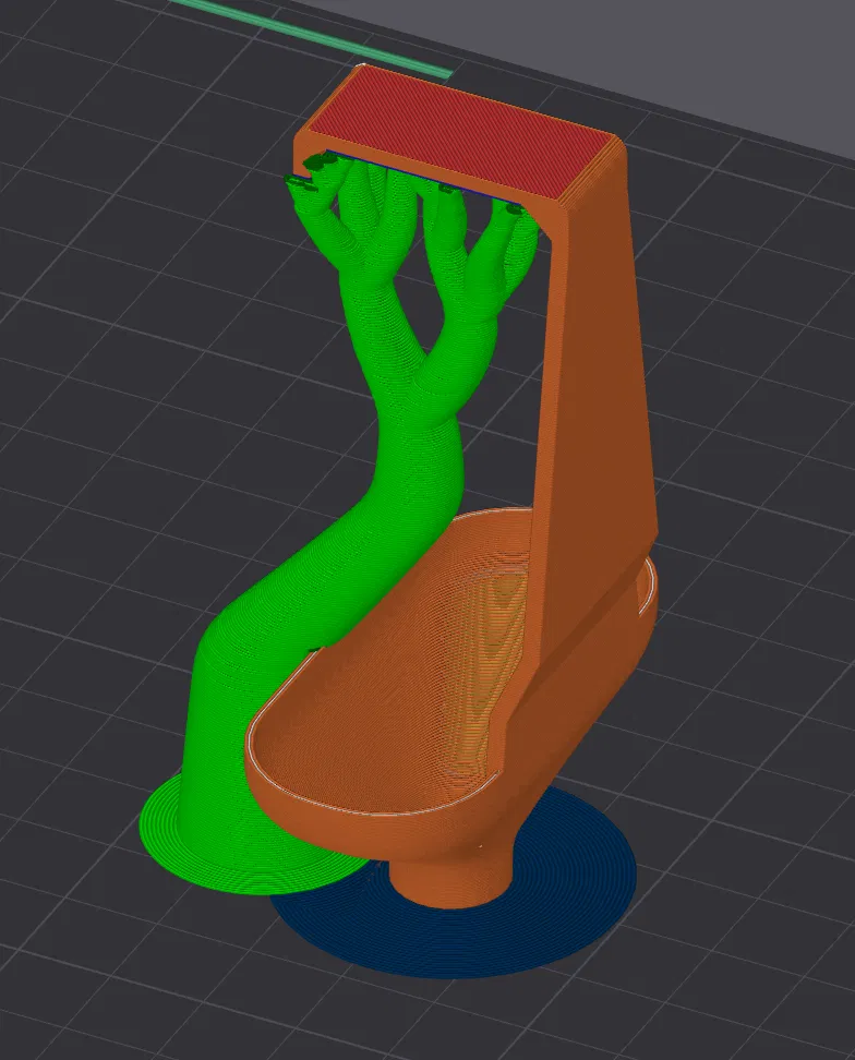 Có thể in úp xuống, thêm brim cho chắc. Em xài tree support cho phần overhang lớn. Có luôn file model cho BambuLab X1C rồi đó ạ.