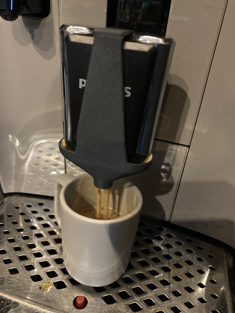 Cốc espresso đơn thì quá nhỏ để đặt vừa dưới vòi đôi của máy Philips nhà em. Cái adapter này sẽ biến vòi đôi thành vòi đơn cho vừa mấy cốc nhỏ xinh.