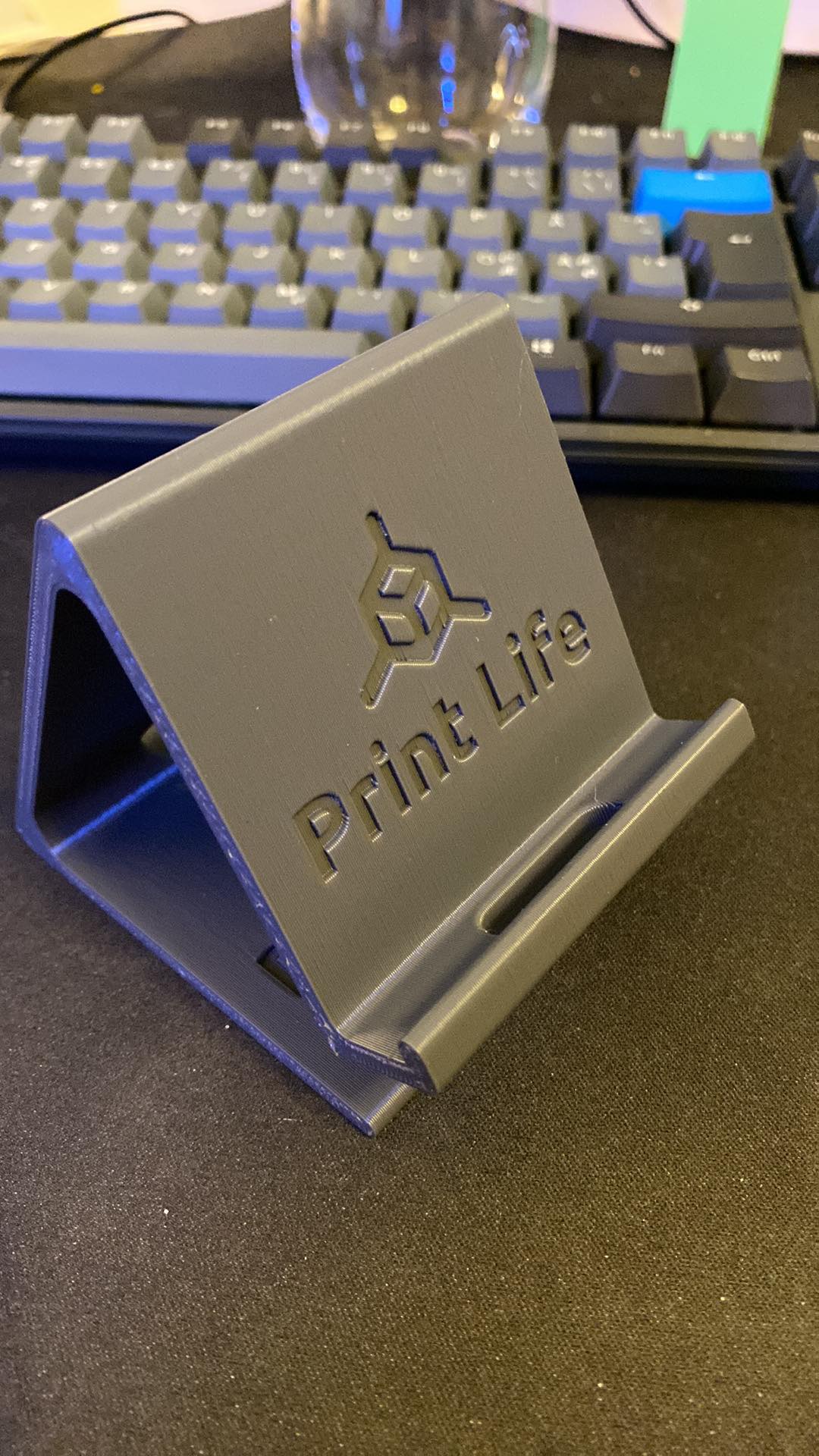 Chân đế điện thoại di động có lỗ cắm sạc. Hình ảnh đi kèm có logo của một doanh nghiệp in 3D từng thuộc sở hữu của tôi.