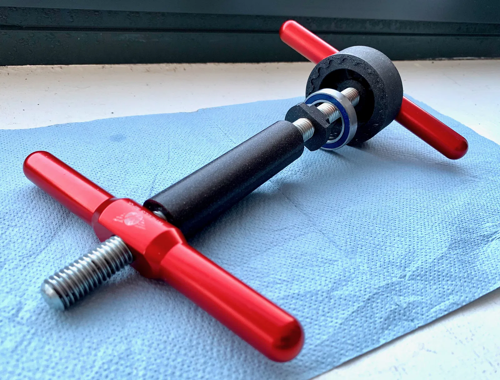 Bộ dụng cụ 3 món, kết hợp với tay cầm và thanh rod, cho phép tháo bạc đạn (bearing) Wheels Mfg BB khỏi cup. Sử dụng sleeve định vị bằng rãnh cup, chỉ tác động lực lên cup, không ảnh hưởng khung. Có thể dùng tay cầm và rod của Wheels Mfg hoặc tùy biến với thanh ren 8-12mm.