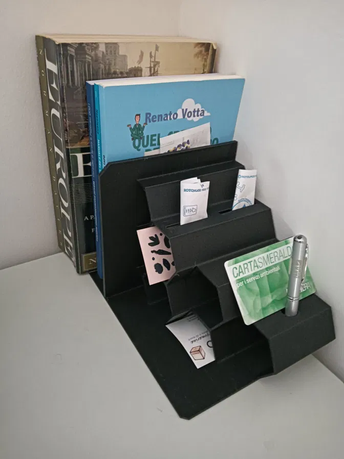 Đây là một cái chặn sách với các ô hình lục giác dạng tổ ong. Mỗi ô có thể dùng làm chỗ để đồ hoặc ví tiền.