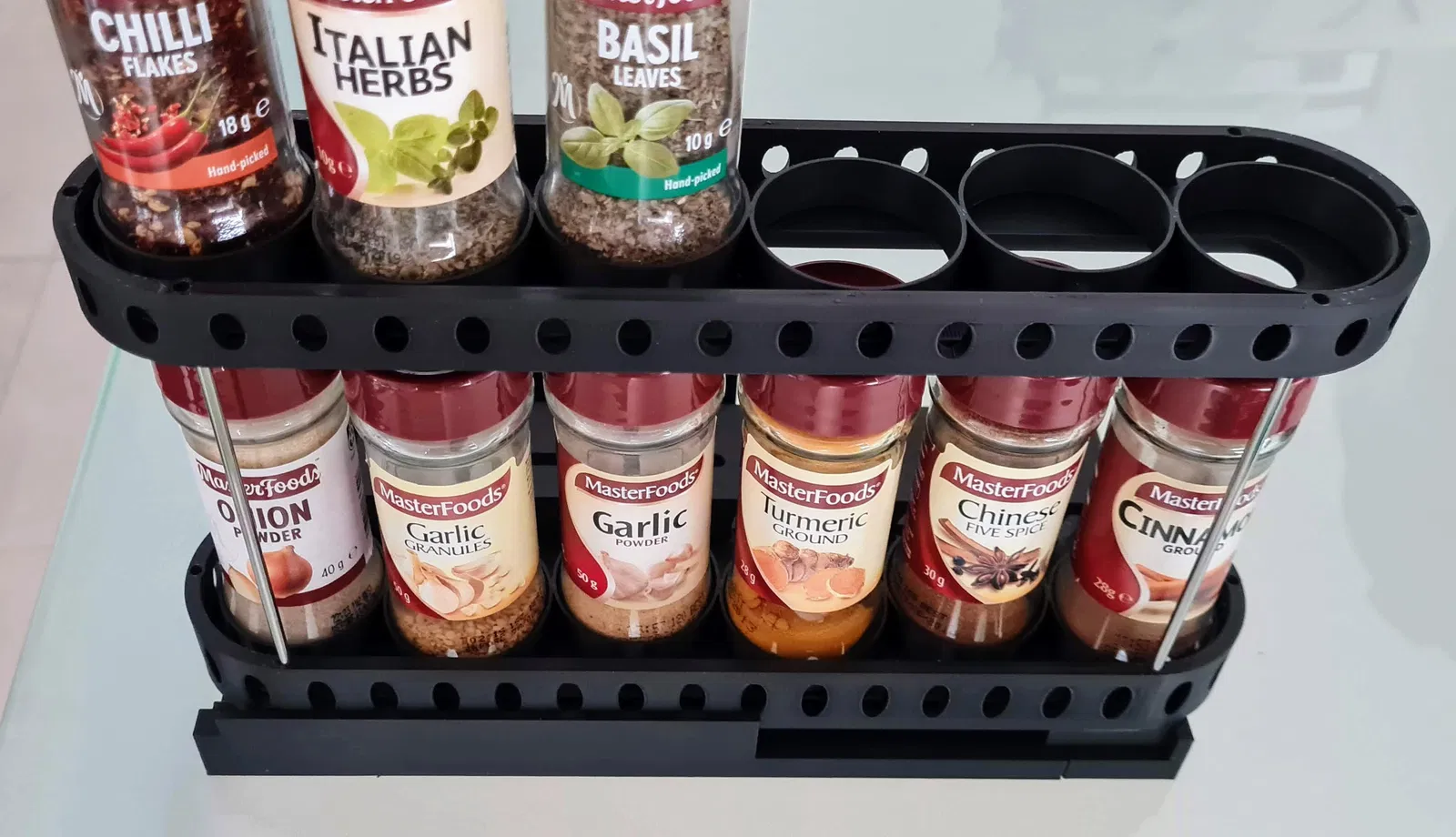 Đây là một khay chia ngăn bổ sung, được thiết kế để giữ các hũ gia vị có đường kính 40mm. Thiết kế ôm khít là có chủ đích để hạn chế rung lắc.