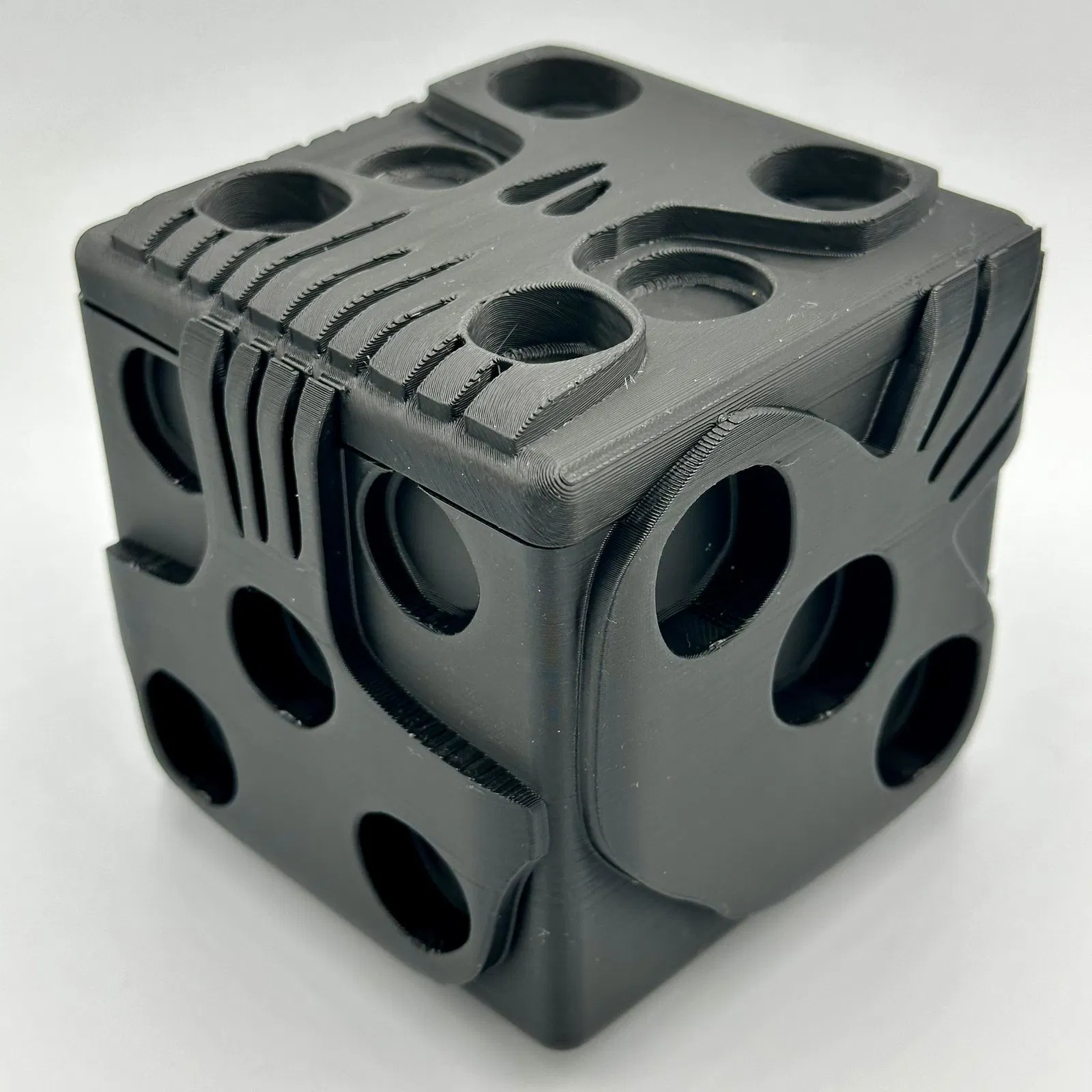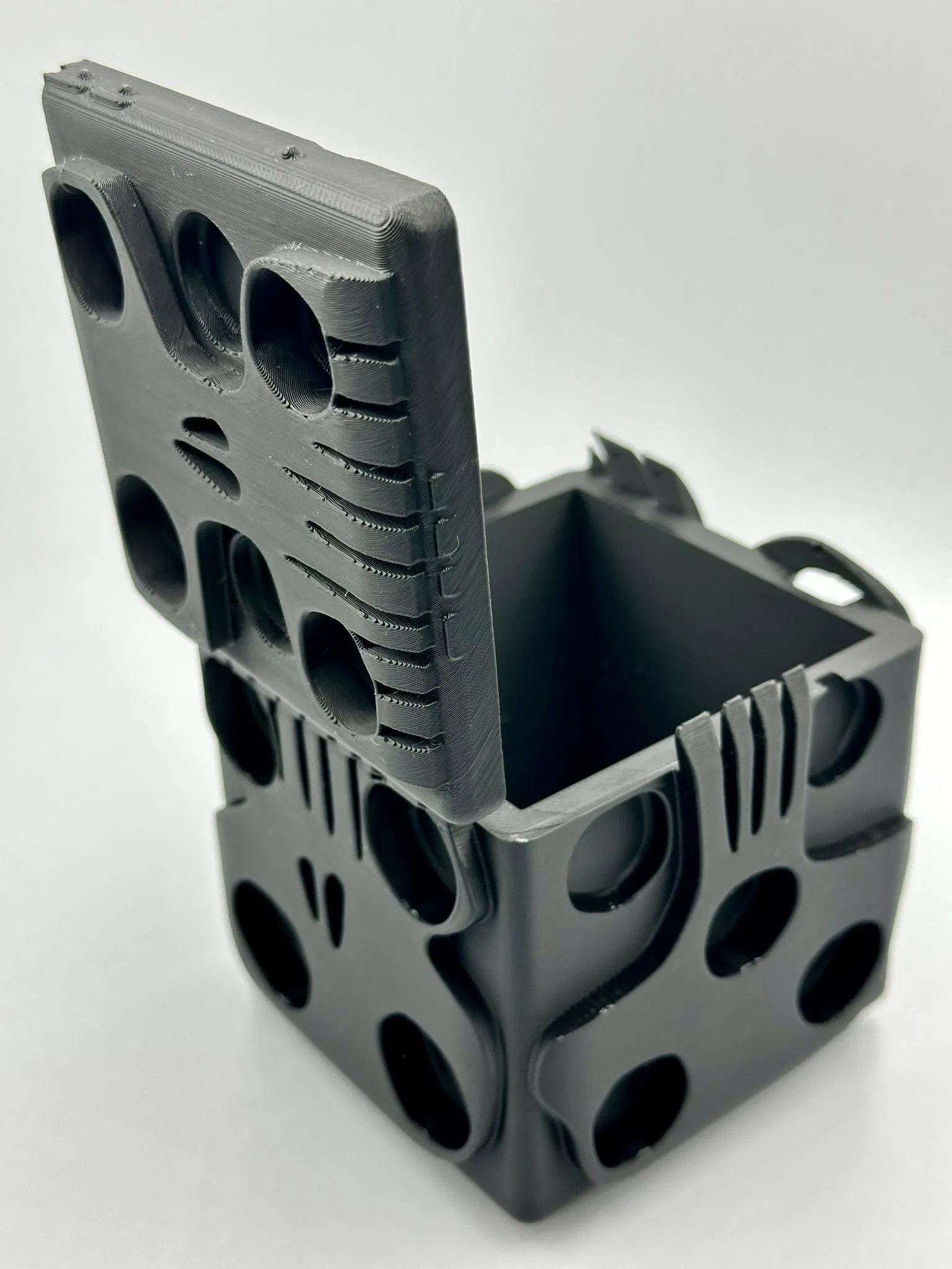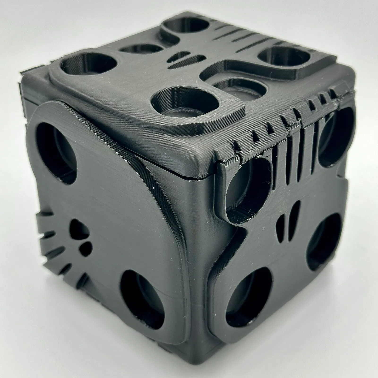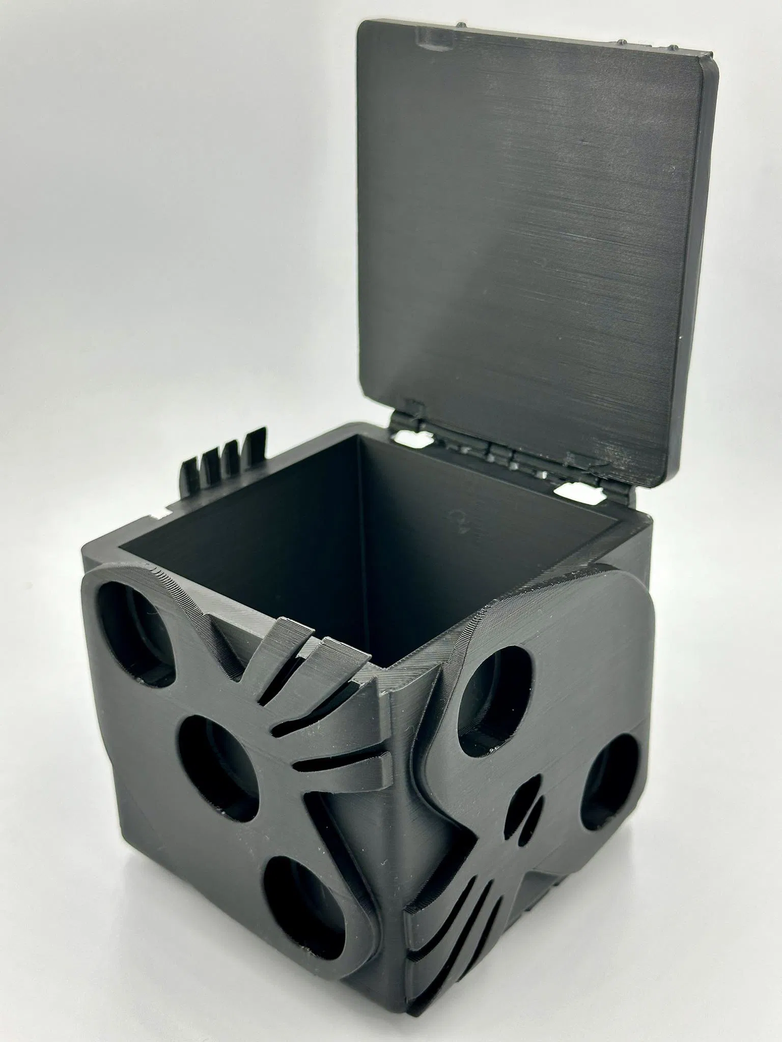 Hộp đựng xúc xắc Oogie Boogie với bản lề ẩn và nắp gập kín, tạo cảm giác liền mạch gần như hoàn hảo. Tải ngay thiết kế độc đáo này từ MakerWorld để thêm phần thú vị cho bộ sưu tập của bạn!