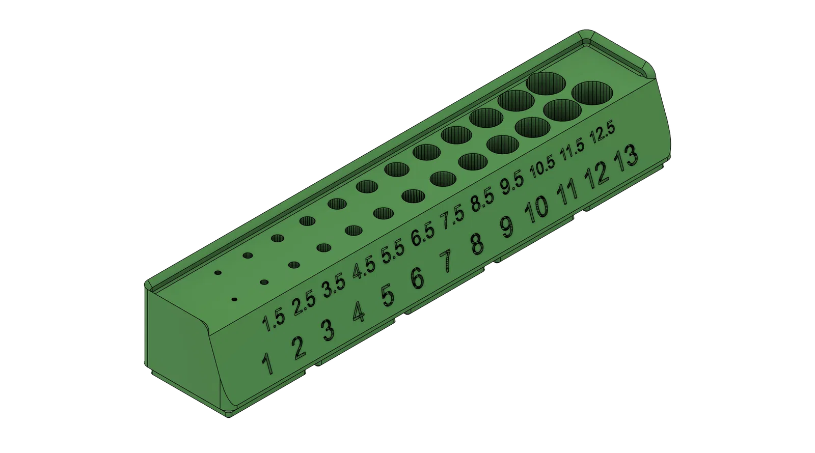 Kệ Giữ Mũi Khoan Gridfinity này được thiết kế để chứa các mũi khoan metric từ 1 mm đến 13 mm, với các bước tăng 0.5 mm. Lý tưởng cho việc sắp xếp và giữ gìn bộ sưu tập mũi khoan của bạn một cách gọn gàng và dễ dàng truy cập.